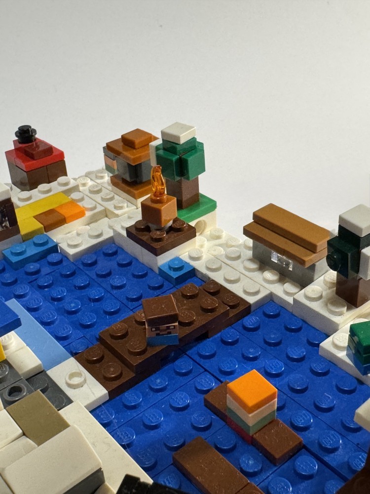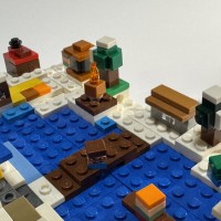 Mini minecrafti teemaline küla. Veekogu ümbritsevad majad, mägi, põllud ja muu. Leia pildilt lammas!