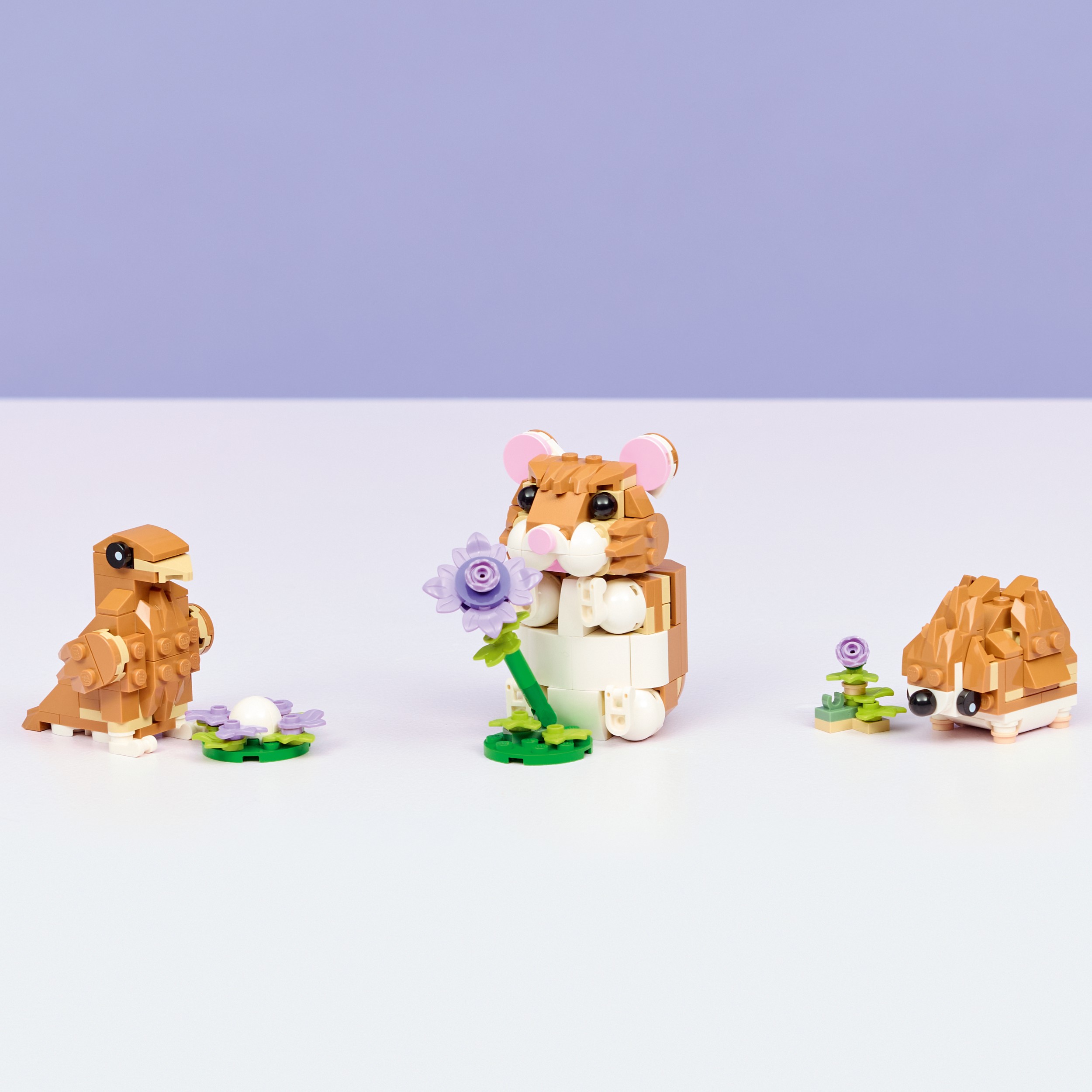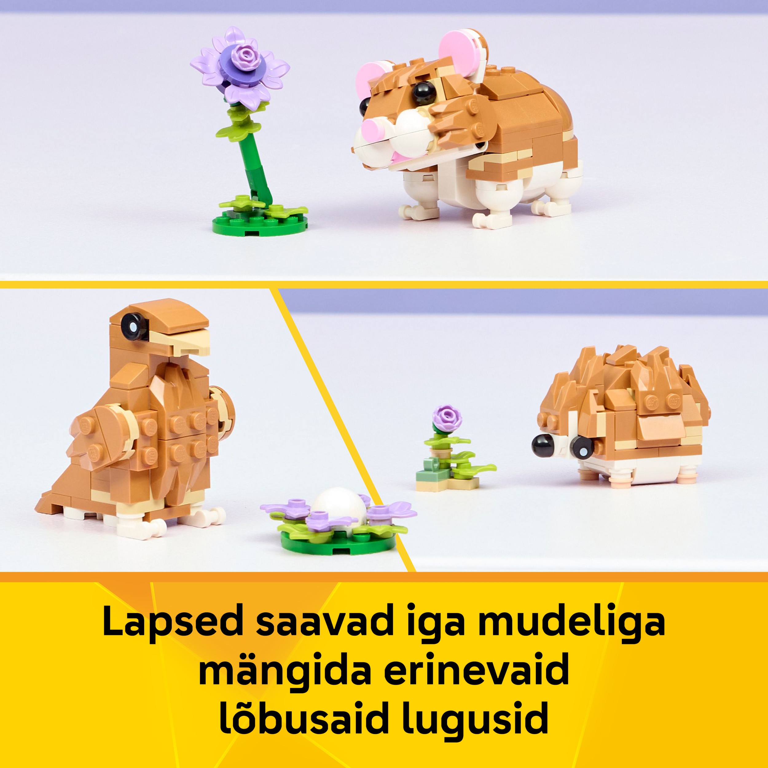 • Lõputud mänguvõimalused – Mängi lõbusaid lugusid kolme väikese loomamänguasjaga (mudeleid ei saa korraga koos ehitada): armas hamster, lillega siilike või linnupesa ja munaga kotkas