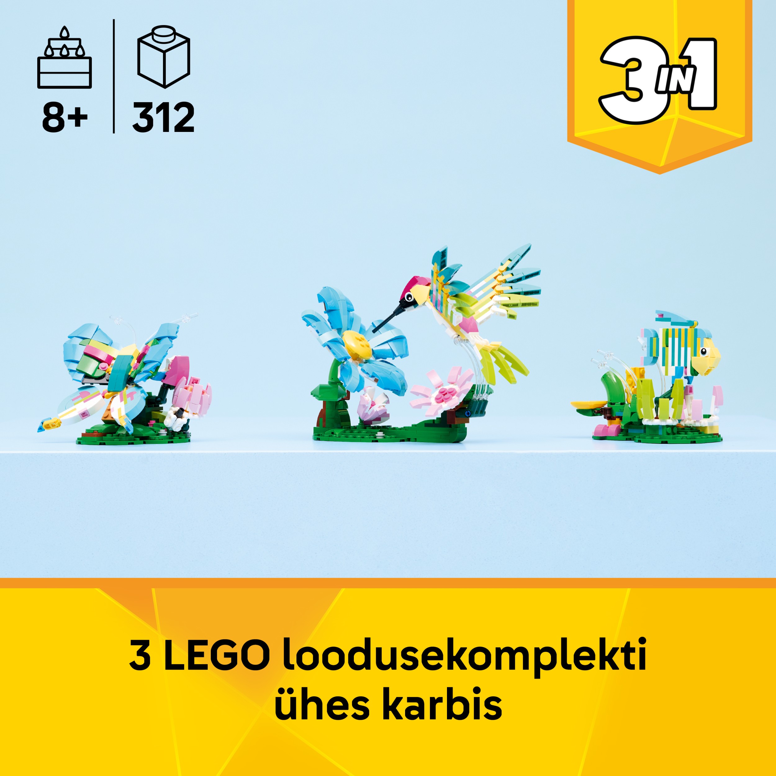 See LEGO Creator sarja kolm ühes komplekt innustab noorte kujutlusvõimet ja on suurepärane kingiidee lastele, kes armastavad loodust ja imelisi loomi. Lapsed saavad ehitada enesekindlalt rakenduse LEGO Builder abil – suumida, pöörata 3D-s ja jälgida edenemist lihtsalt järgitavate digitaalsete juhiste abil. Mudeleid ei saa korraga koos kokku panna! Komplektis on 312 osa.