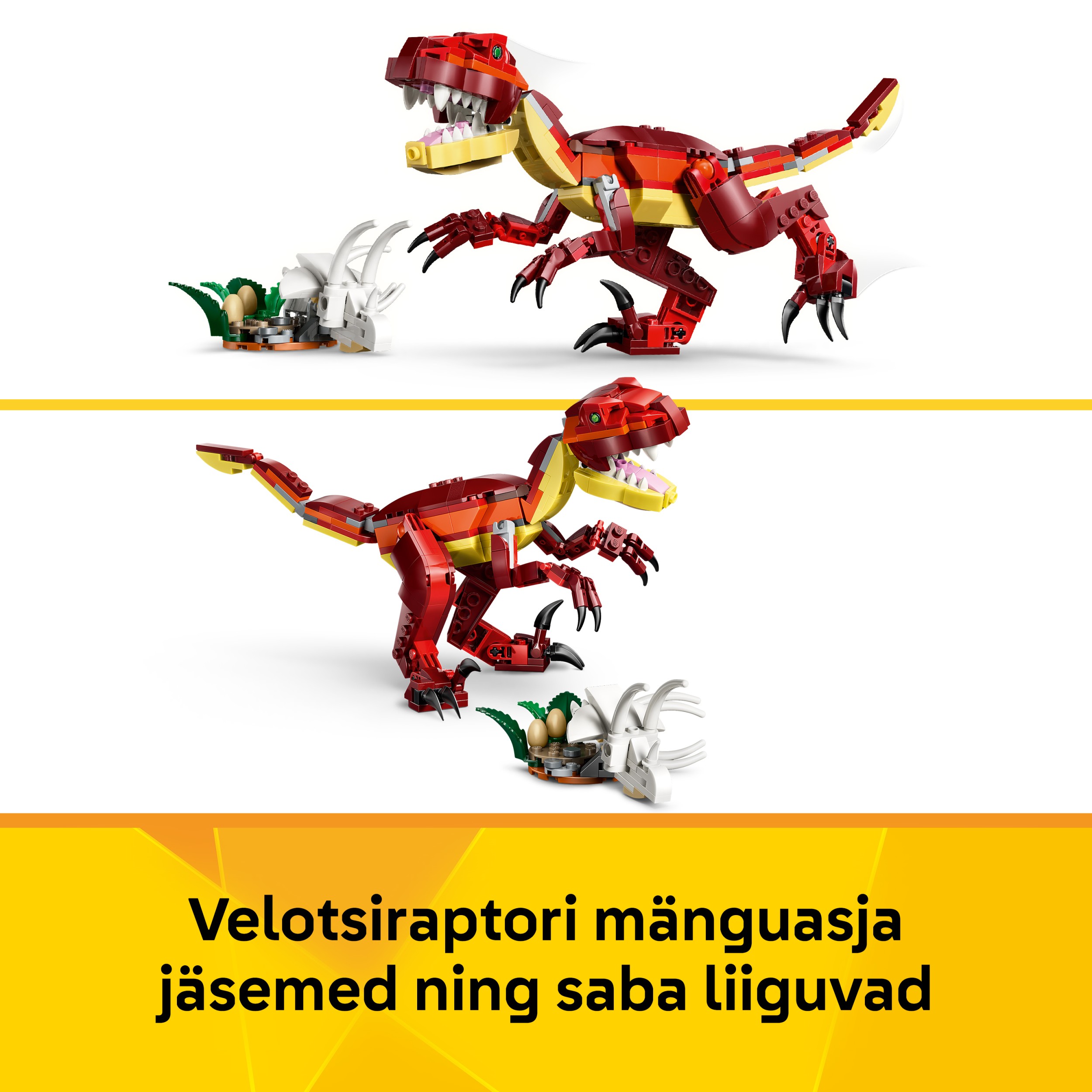 - Lõputud mänguvõimalused – Lppsed saavad nautida loomingulisi lugusid kolme dinosaurusefiguuriga (mudeleid ei saa korraga koos ehitada): velociraptori mänguasi või stegosaurus või pterosaurus