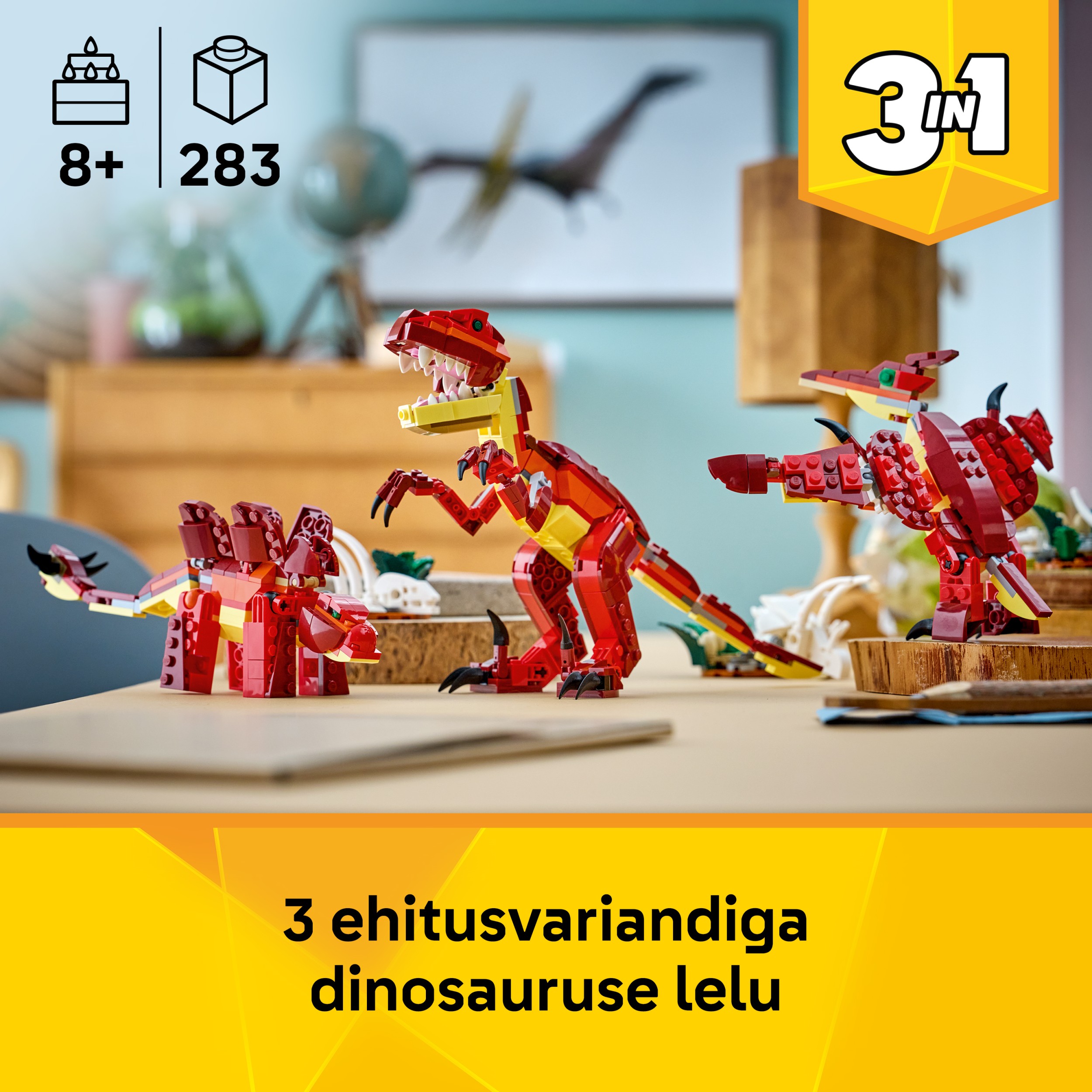 - Kolm ühes dinosaurusemänguasi – LEGO® Creator kolm ühes raevuka dinosauruse (31379) ehituskomplekt võimaldab 8-aastastel ja vanematel poistel, tüdrukutel ja lastel samade klotsidega ehitamise ja ümberehitamise käigus loov olla