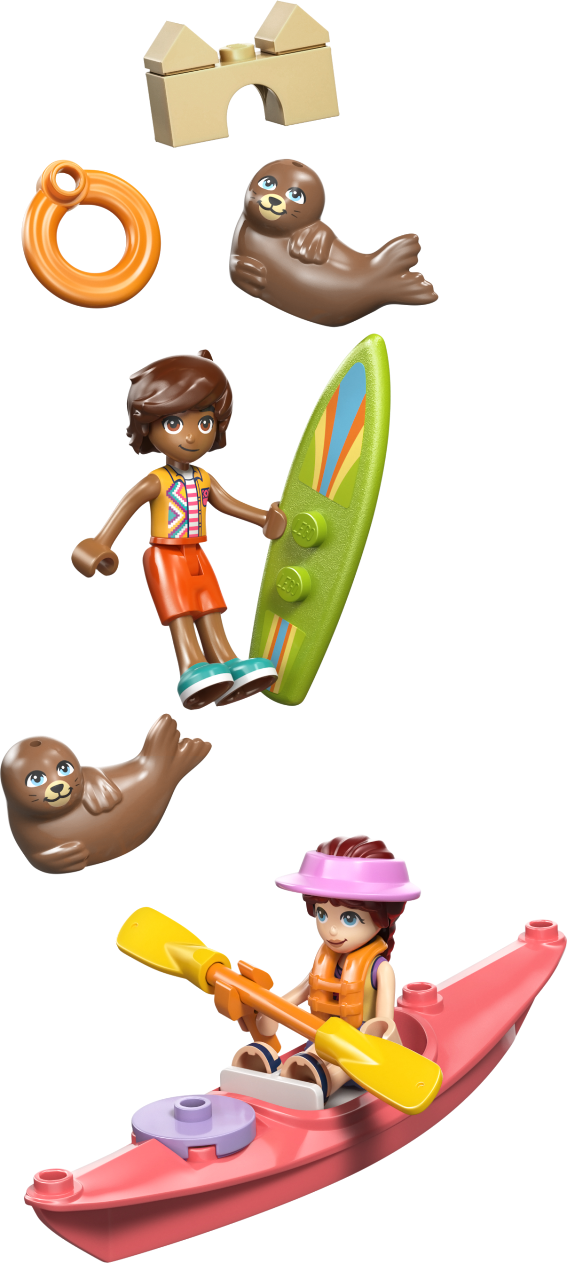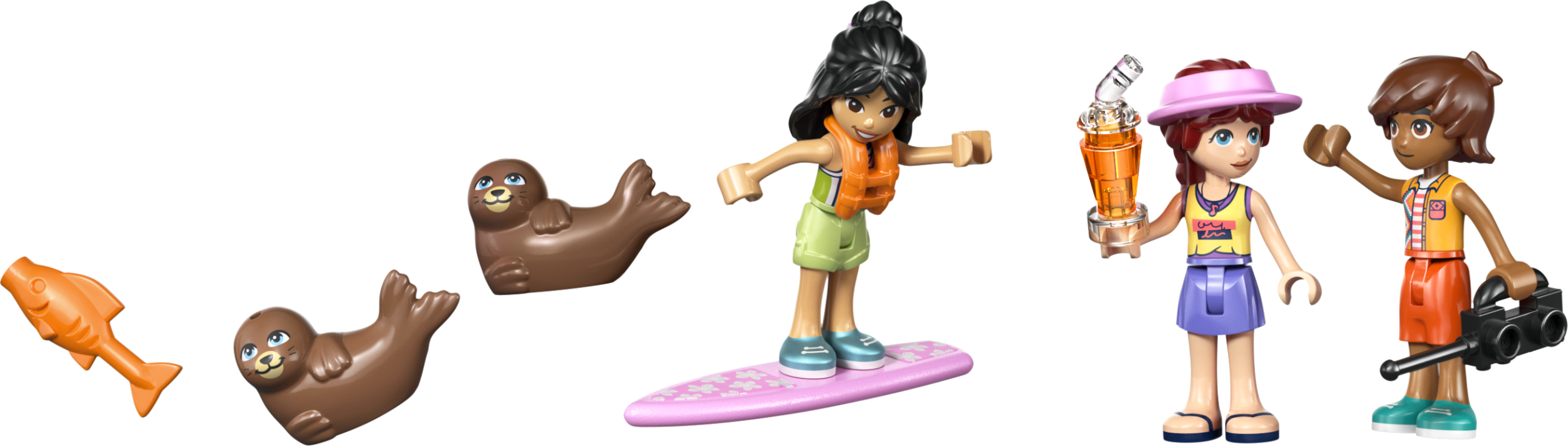 - 3 LEGO® FRIENDS TEGELAST – Komplektis LEGO® Friends rannamaja hüljestega (42699) on mininukud Leo, Liann ja Paisley ning 2 mängulooma, mis inspireerivad fantaasiamänge
