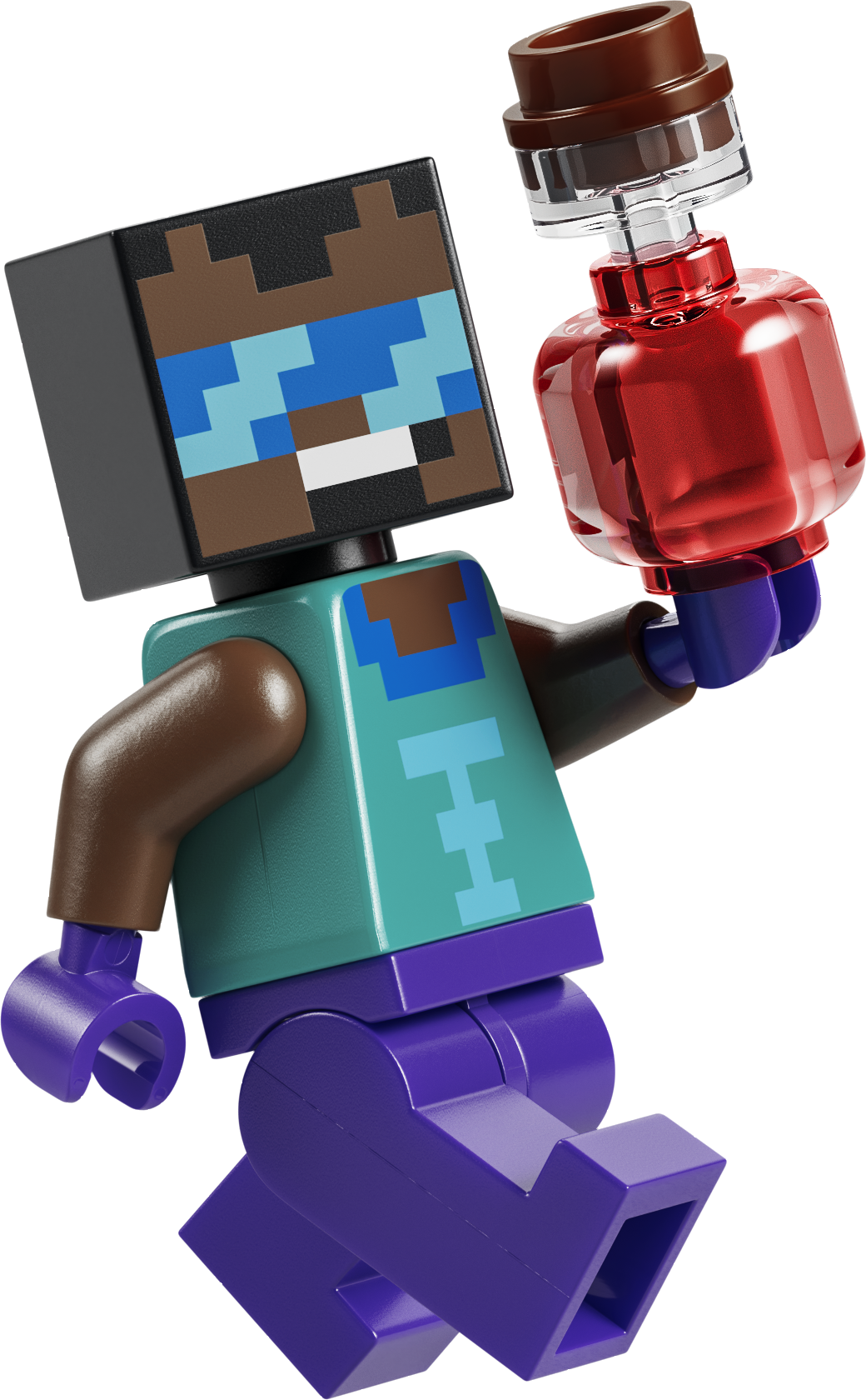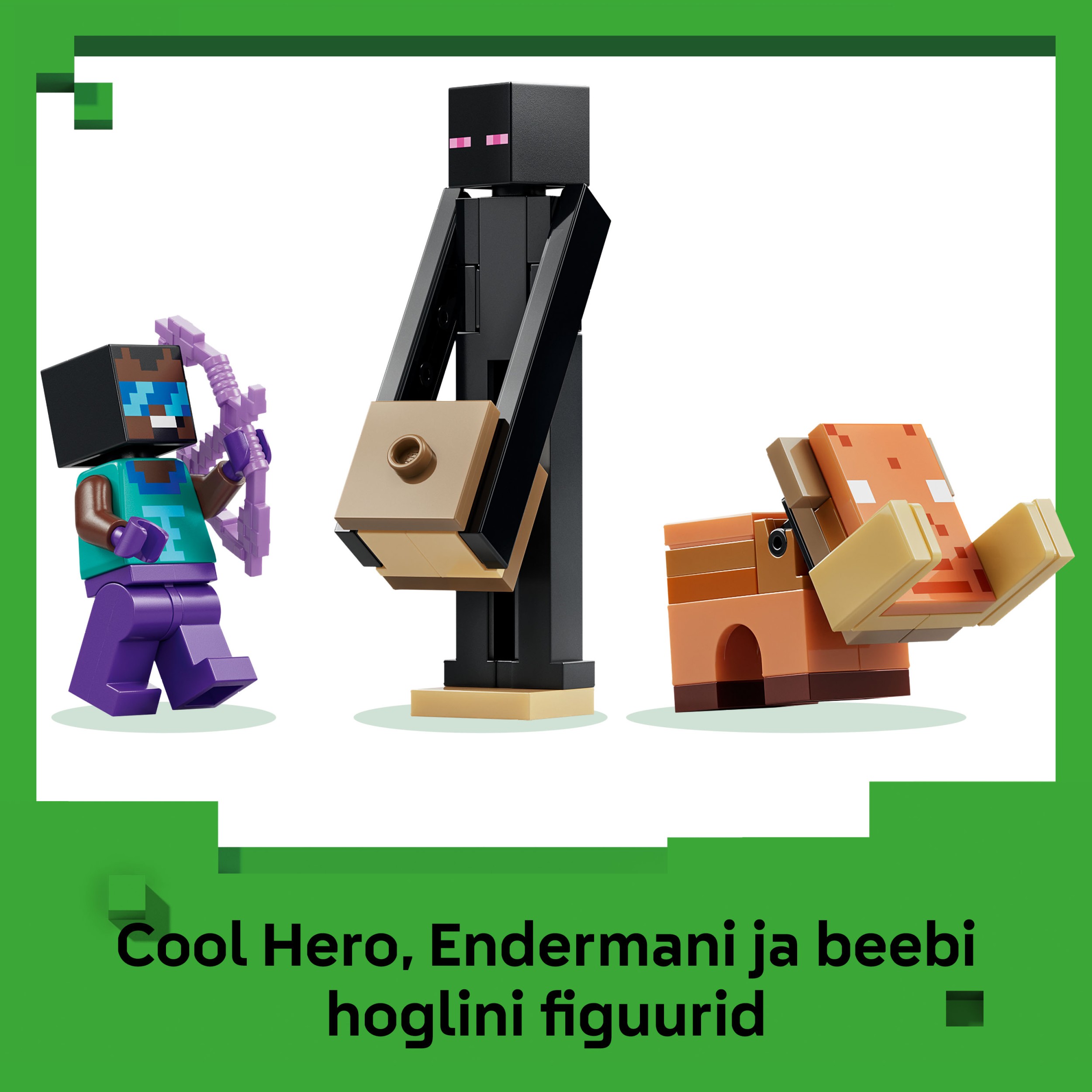 - 3 tegelaskuju, 2 portaali – aktiveeri mänguportaalid ja astu neist läbi, et leida mõlemast bioomist LEGO® mudel ja Minecraft® tegevus laheda kangelase minifiguuriga, lisaks Endermani ja hoglinibeebi figuurid