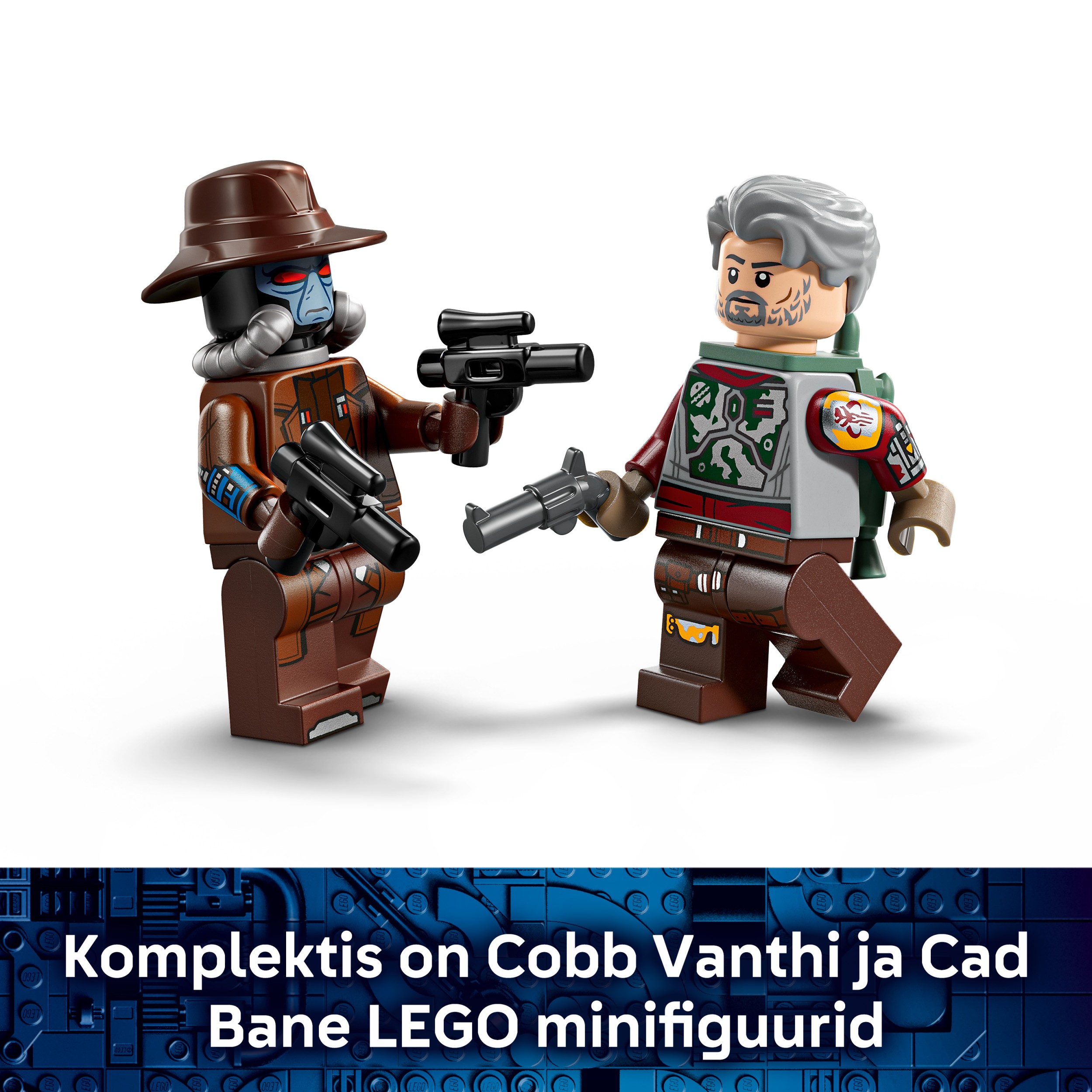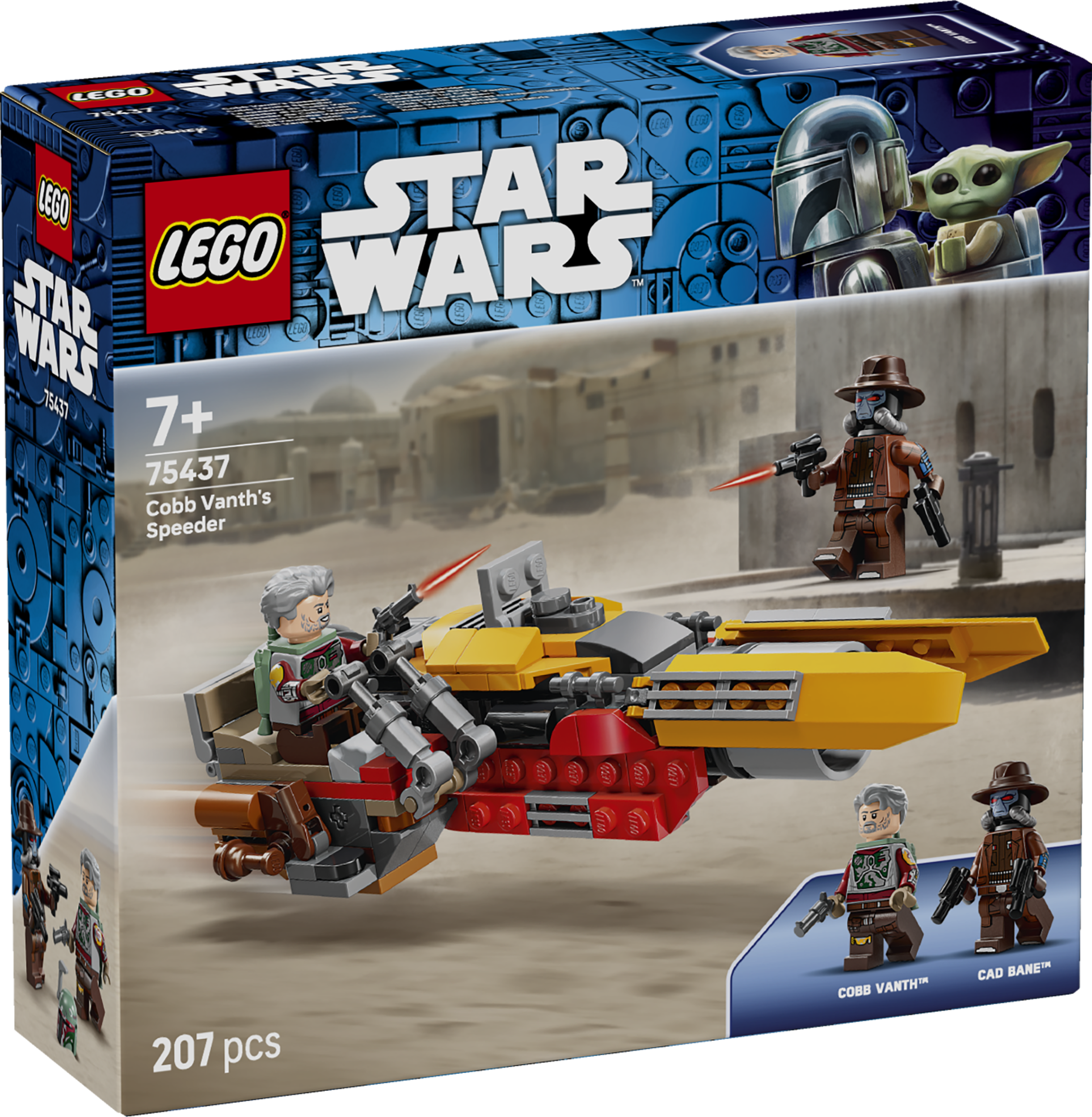 Selle põneva LEGO® Star Wars™ sõiduki ehituskomplektiga (75437) saad koos Cobb Vanthiga etendada põnevaid lahinguid Cad Bane'i vastu. Ehita Cobb Vanthi vinge kihutaja üksikasjalik LEGO klotsidest mudel sarja Star Wars: The Mandalorian 3. hooajast. Sellel on juhiiste Cobb Vanthi LEGO minifiguuri jaoks, klamber tema püstoli jaoks ja peidetud sektsioon legendaarsete tarvikute, sealhulgas Boba Fetti kiivri ja bantapiima paigutamiseks. Komplektis on Cad Bane'i LEGO minifiguur, mis on varustatud kahe kahuripüstoliga, ning Cobbil on ka õhumäruliks mõeldud reaktiivseade.
