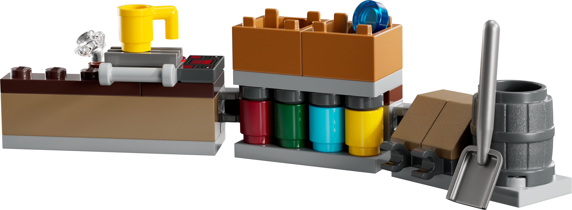 - 9 minimudelit – tööpink, tool, tööriistariiul, riiulid, karp lisadroidiosadega, kraana ja ämber droidisepa töökoja loomiseks, lisaks Jawa kokkupandav sõiduk ja jõulupuu