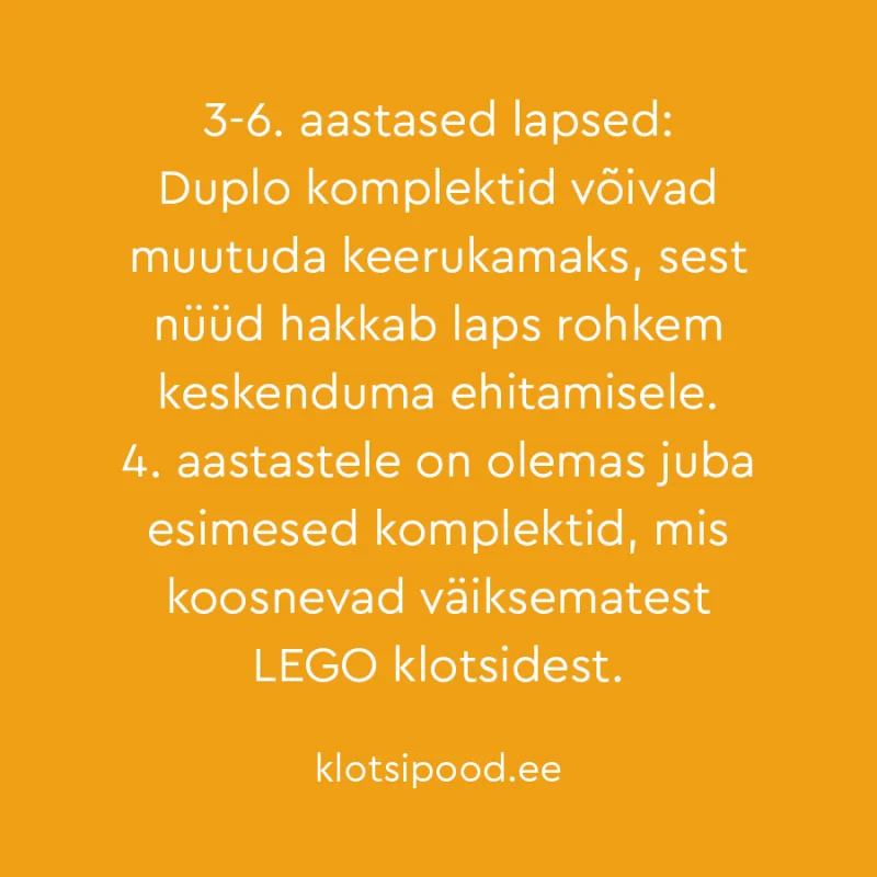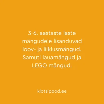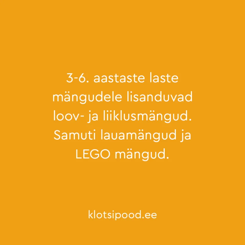 3–6-aastaste laste mäng muutub juba mitmekesisemaks. Lisanduvad loovmängud, rollimängud, lauamängud ja ehitamine. Laps suudab rohkem keskenduda ning keerukamad mänguasjad pakuvad talle suuremat huvi. Umbes 4. eluaastast alates on paljud lapsed valmis proovima ka väiksematest detailidest koosnevaid komplekte, mille juhendid on juba piisavalt lihtsad, et neid iseseisvalt jälgida.