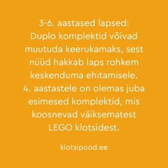 Väikelapse jaoks on mängimine üks põhivajadusi. See on tegevus, mis peab olema vaba ja sundimatu – ainult siis pakub see tõelist huvi ja arenguvõimalust. Kui mäng on liiga lihtne või vastupidi, liiga keeruline, kaob lapsel kiiresti motivatsioon. Seetõttu on oluline valida mängud, mis vastavad lapse vanusele ja individuaalsetele oskustele, pakkudes talle parasjagu väljakutset ja eduelamust. Ka LEGO komplekte valides, tasub jälgida karbil olevat vanuse soovitust, et hoida ja toetada lapse mänguhuvi.