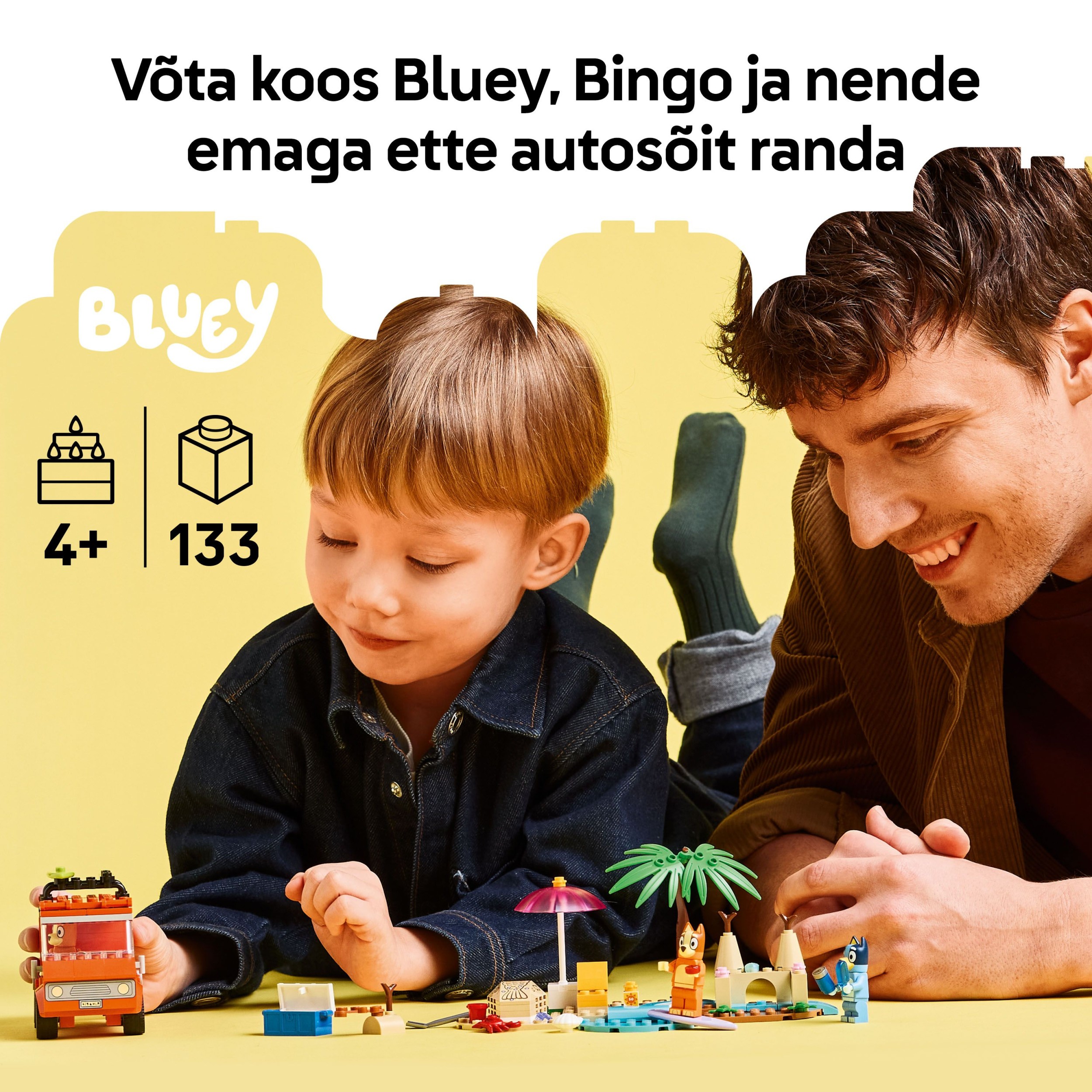Blueyn perheen autoretki rannalle ‑setin (11202) leikeissä Bluey, Bingo ja äiti pakkaavat auton ja lähtevät viettämään hauskaa päivää rannalla. Alle kouluikäisille Bluey-TV-sarjan faneille suunnattu interaktiivinen lelu on loistojuttu yli 4-vuotiaille. Setti innostaa loputtomiin mielikuvitusleikkeihin, joiden lomassa myös luovuus ja ongelmanratkaisutaidot kehittyvät.
