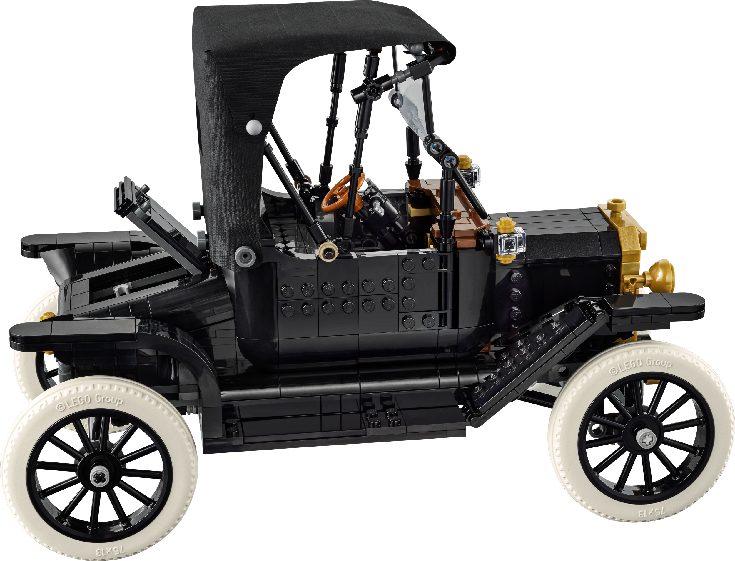 - VINTAGEAUTO – Rakenna legendaarinen 1910-luvun auto, jossa on kiiltävä musta kori, kullanväriset yksityiskohdat, taitettava kangaskatto, isot vanteet ja kapeat valkoiset kumirenkaat