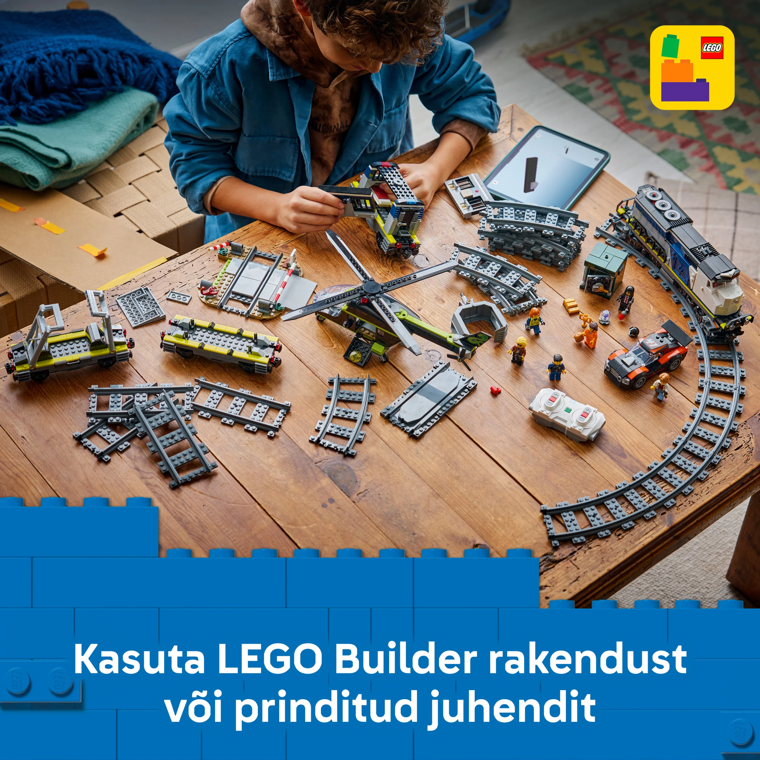 - PAKKAUKSEN SISÄLTÖ – Junasetin osista lapset voivat rakentaa Powered Up ‑veturin, 3 vaunua, ralliauton, helikopterin, vankisellin, kassakaapin, radan ylityskohdan ja 6 minihahmoa