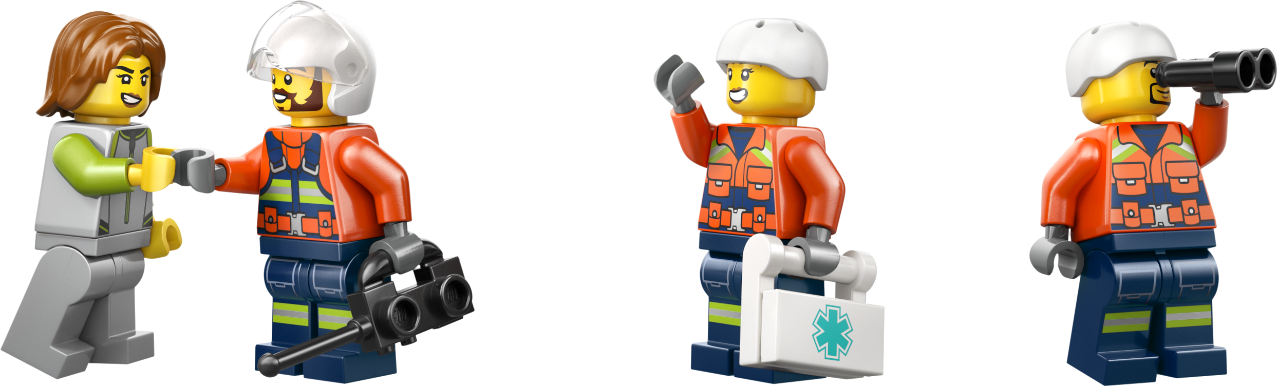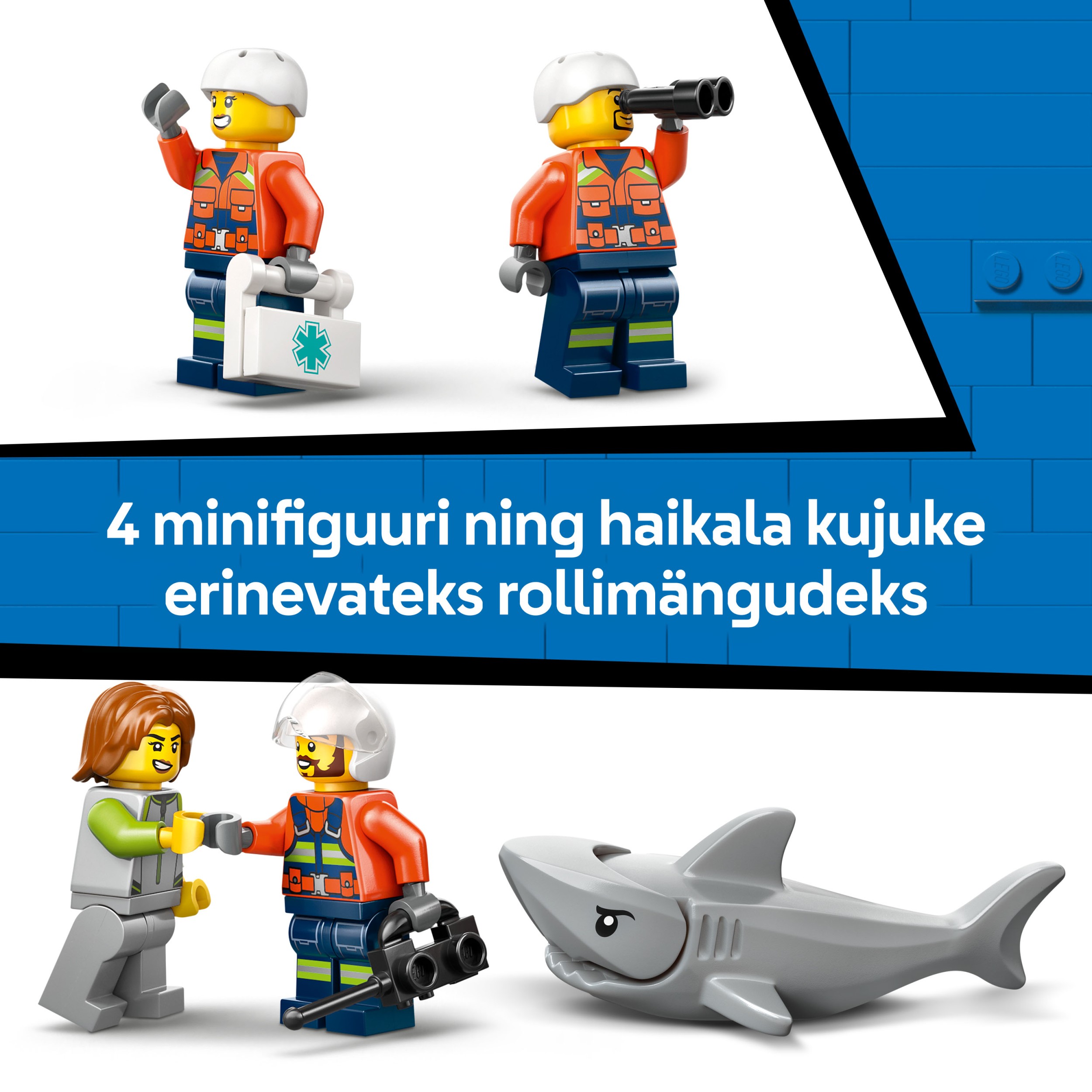 - TARVIKKEITA LEGO® MINIHAHMOILLE – Sisältää ensiapupakkauksen, kiikarit, radiopuhelimen ja pelastusrenkaan mielikuvitusleikkejä innoittamaan