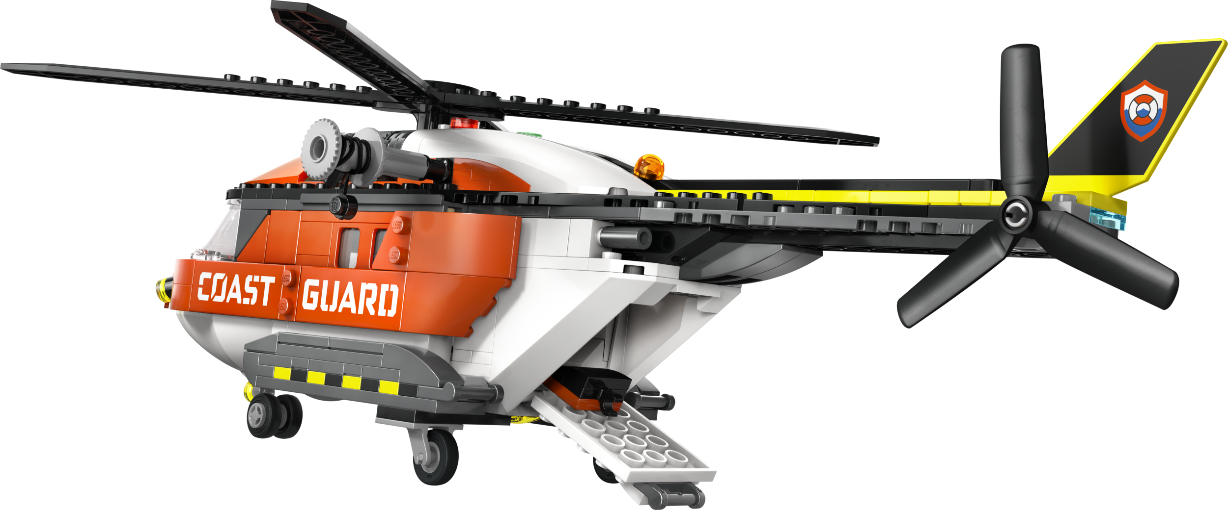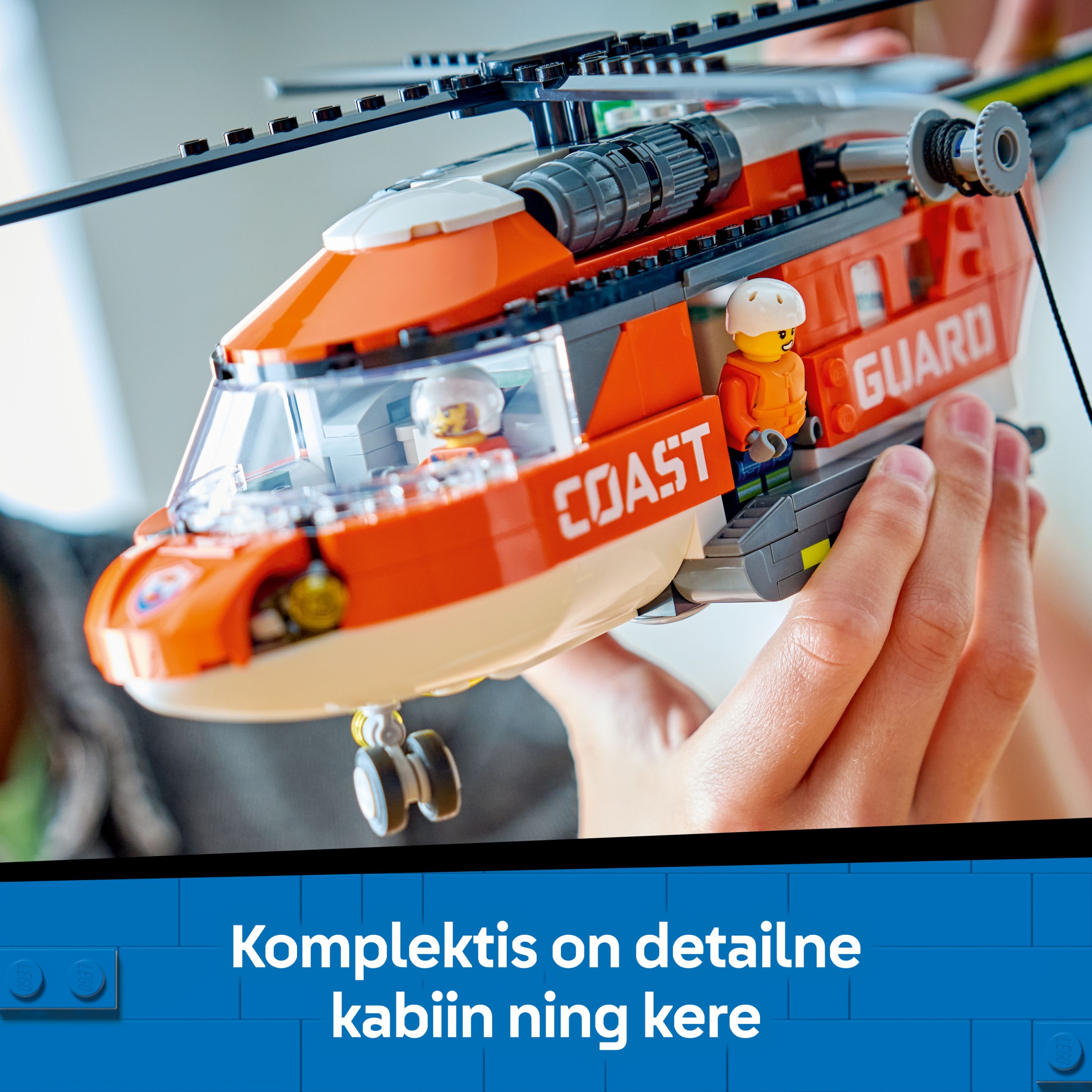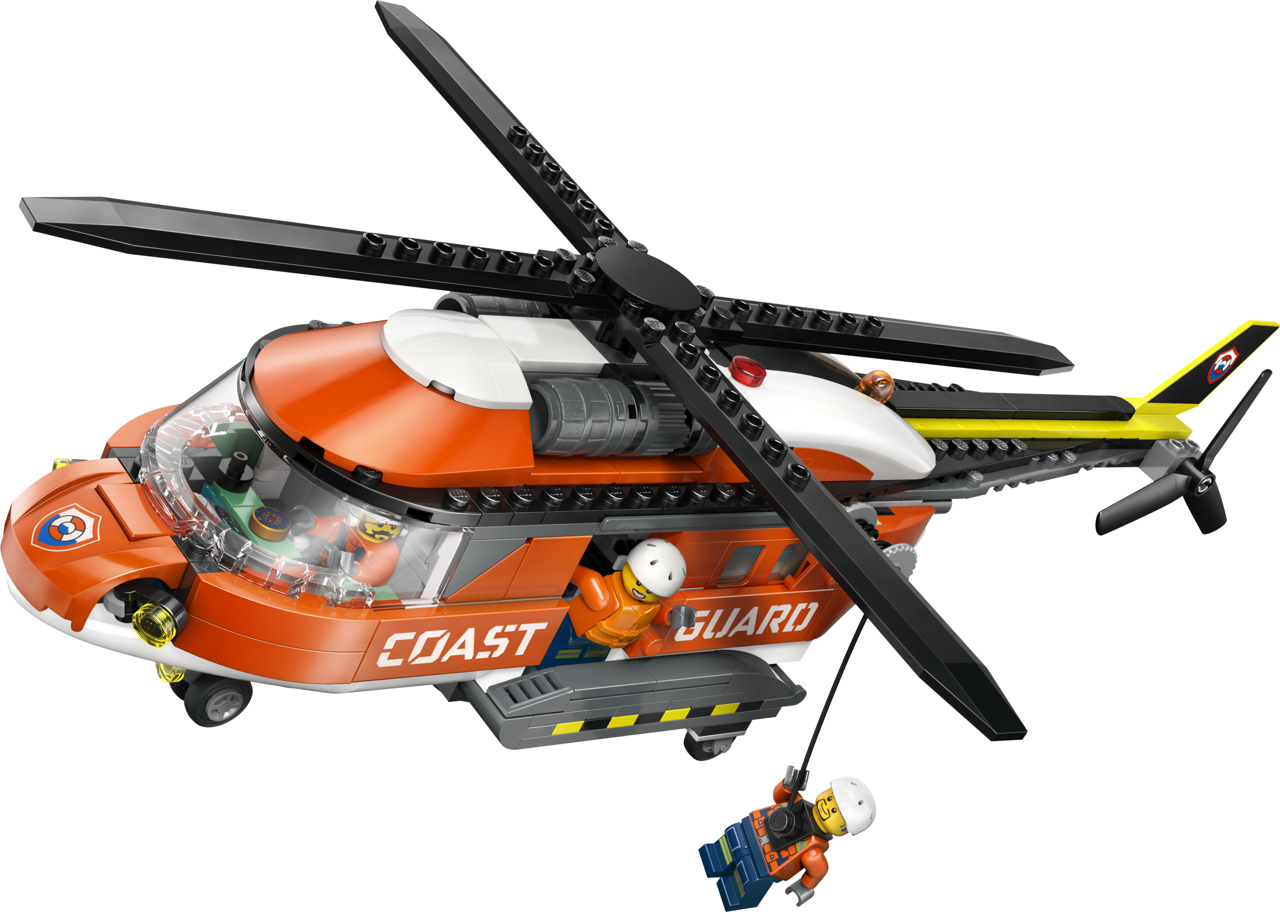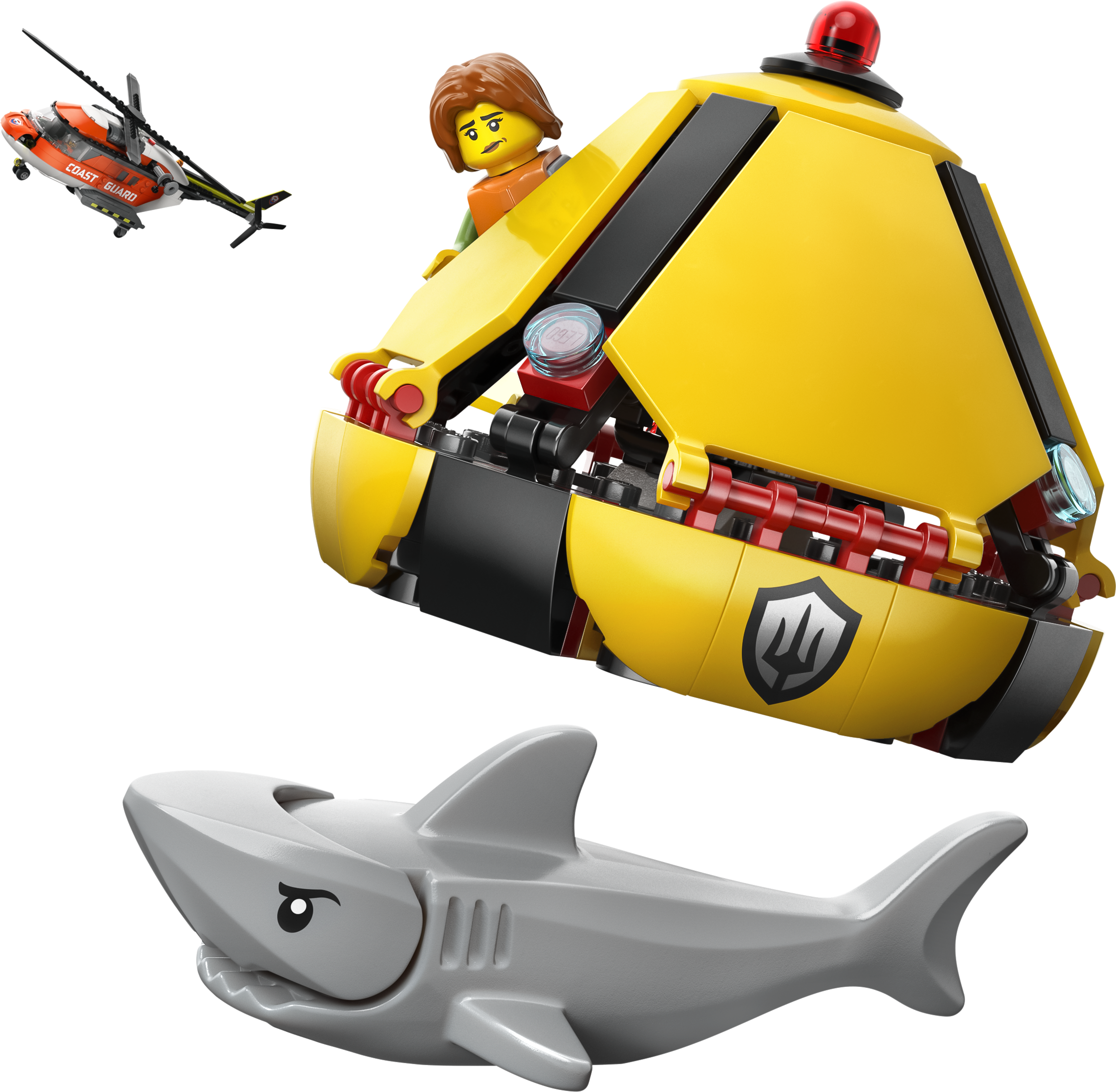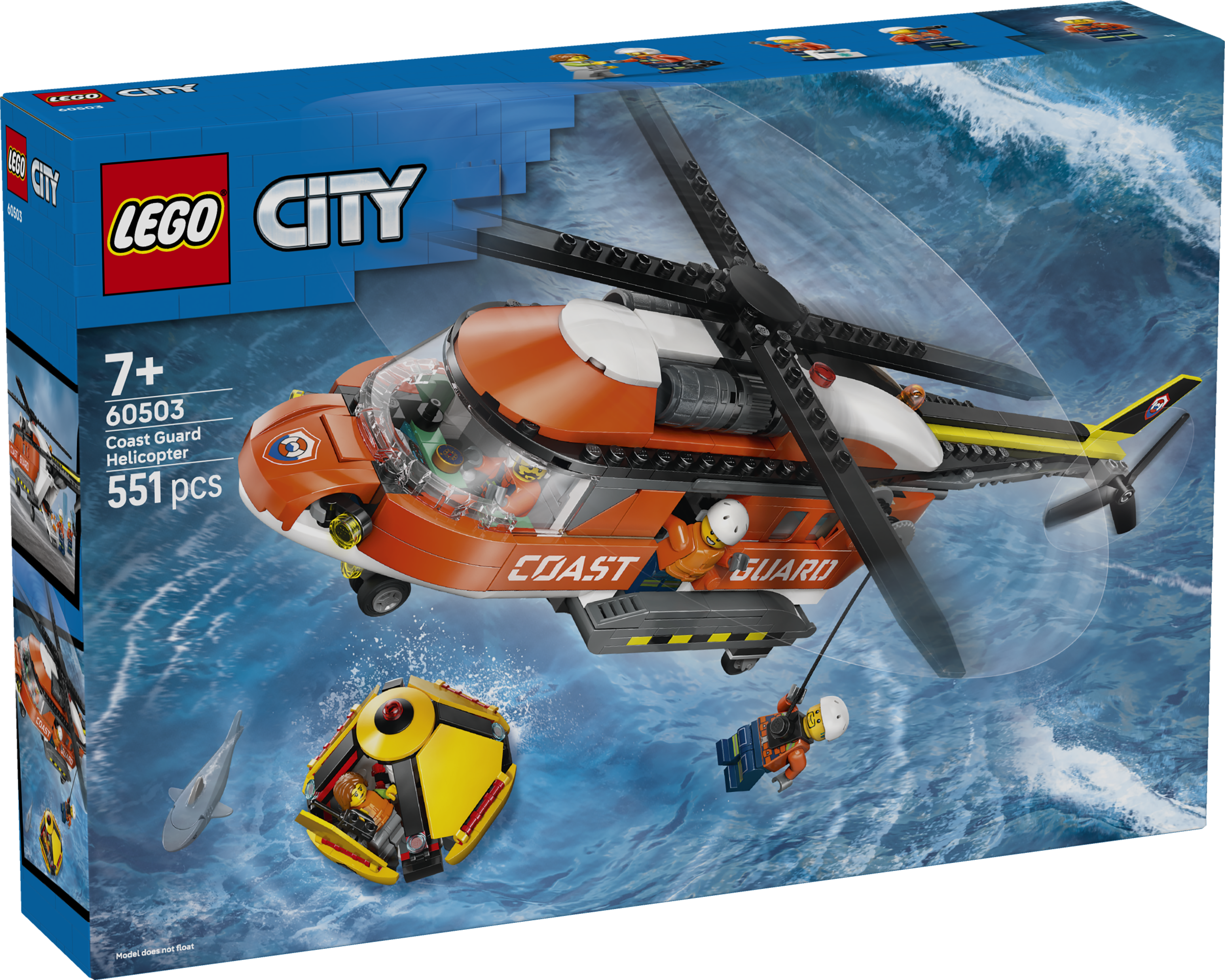 - PAKKAUKSEN SISÄLTÖ – Lapset voivat rakentaa osista yksityiskohtaisen meripelastushelikopterin ja pelastuskapselin, ja mukana on myös lentäjän, siviilin ja kahden rannikkovartijan minihahmot sekä haihahmo