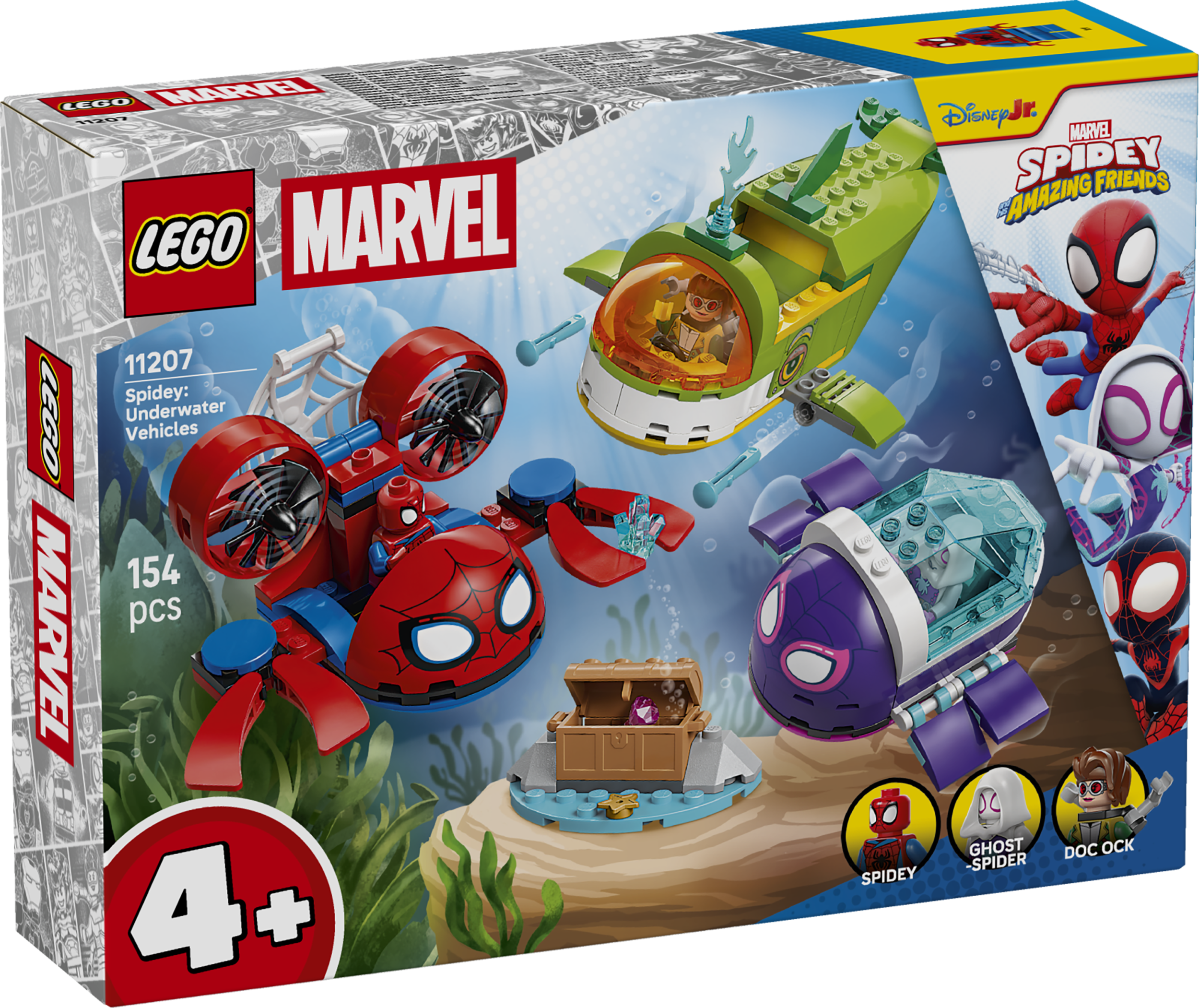 Spidey ja vedenalaiset menopelit ‑leikkisetin (11207) parissa yli 4-vuotiaat pojat, tytöt ja LEGO® ǀ Marvel fanit voivat suunnata mielikuvitusseikkailuihin. Luovuutta kehittävä rakennussetti sisältää Spideyn, Ghost-Spiderin ja tohtori Mustekalan minihahmot sekä 3 sukellusvenettä.