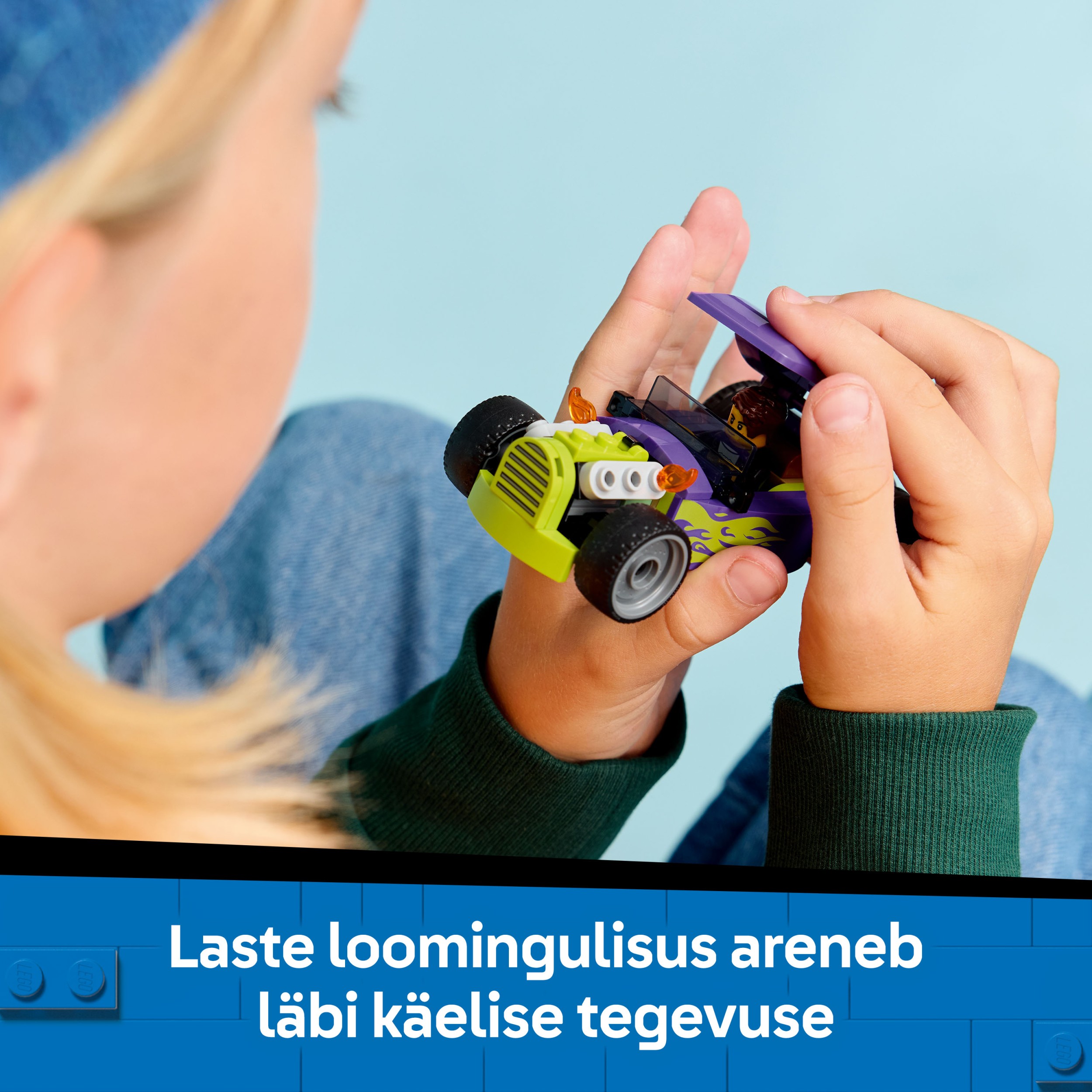 - KLASISKS ROTAĻU AUTO BŪVĒŠANAS KOMPLEKTS. Iekļauts viss, kas bērniem nepieciešams, lai uzbūvētu klasisku rotaļu lieljaudas auto ar lielām aizmugures riepām un izteiksmīgu, violetu krāsu shēmu, ko papildina neona zaļas liesmas