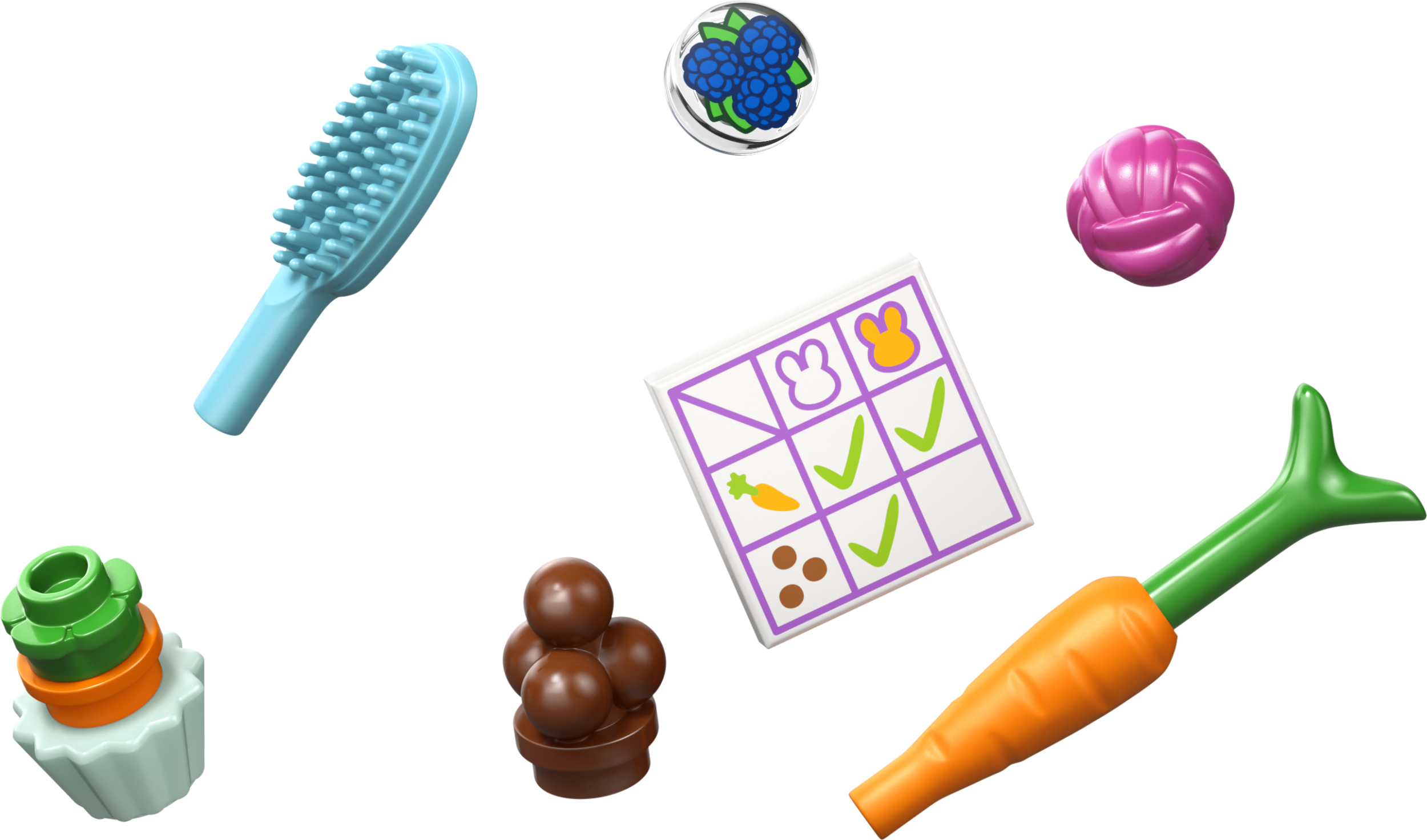 - ROTAĻU TRUSĪŠU AKSESUĀRI. Iekļauti daudzi aksesuāri par dzīvnieku tematiku trusīšu kopšanai, piemēram, suka, dzijas kamols, burkānu kūciņa, barība un ūdens, un liekšķere, ar ko savākt trušu spiras