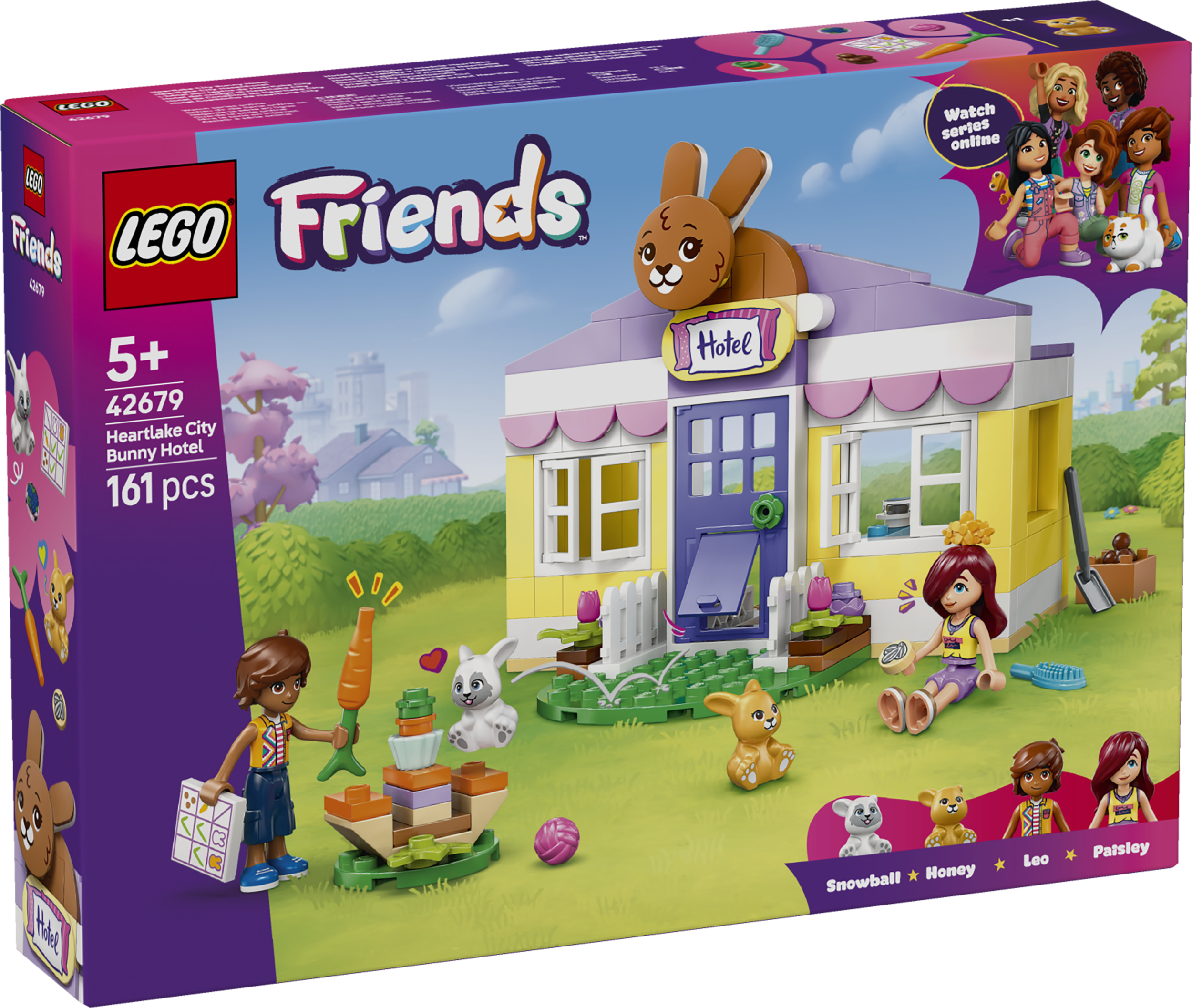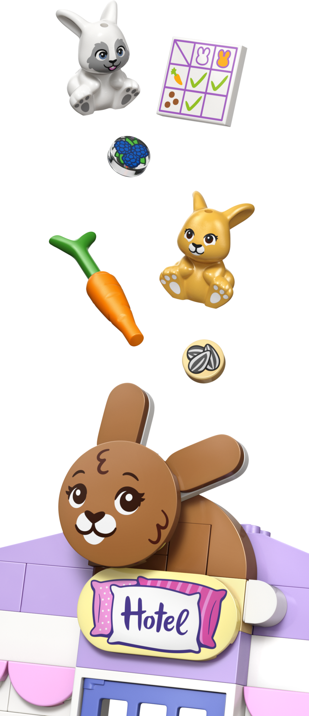 Ielec stāstos ar LEGO® Friends Hārtleikas pilsētas trušu viesnīcu (42679) – rotaļlietu meitenēm un zēniem no 5 gadu vecuma. Šajā rotaļlietā ir 2 minilellītes un 2 rotaļu truši, kas bērniem ļauj stāstīt stāstus par dzīvnieku aprūpi.