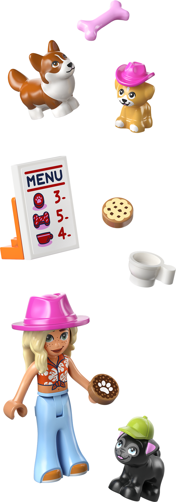 - 2 LEGO® FRIENDS PERSONĀŽI. Komplektā ir Alijas un Sage minilellītes, kā arī 4 rotaļu suņi un daudzas dzīvniekiem draudzīgas detaļas, piemēram, mājdzīvnieku durtiņas, rampa, kārumi, interesantas zīmes un mājdzīvnieku pārvadātājs