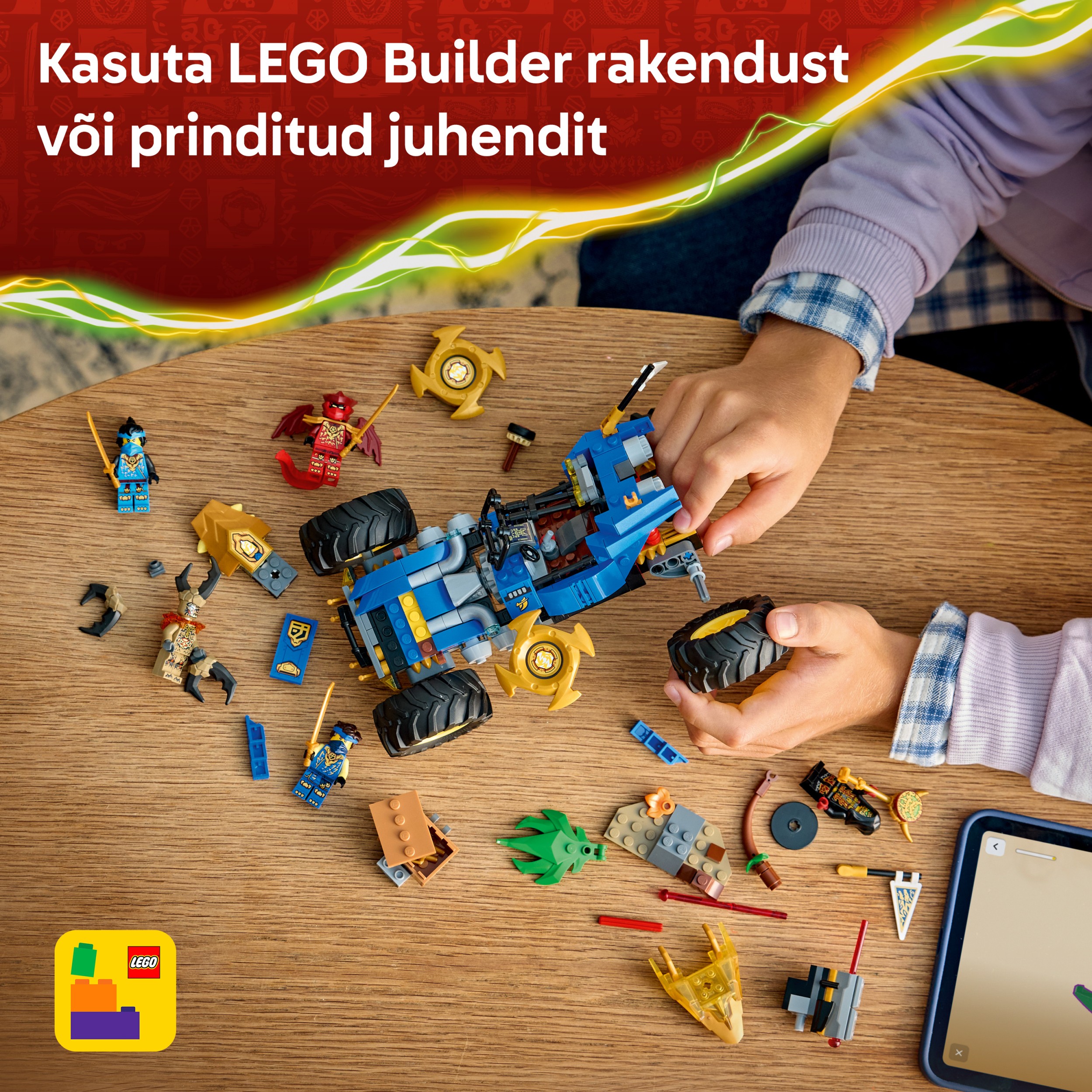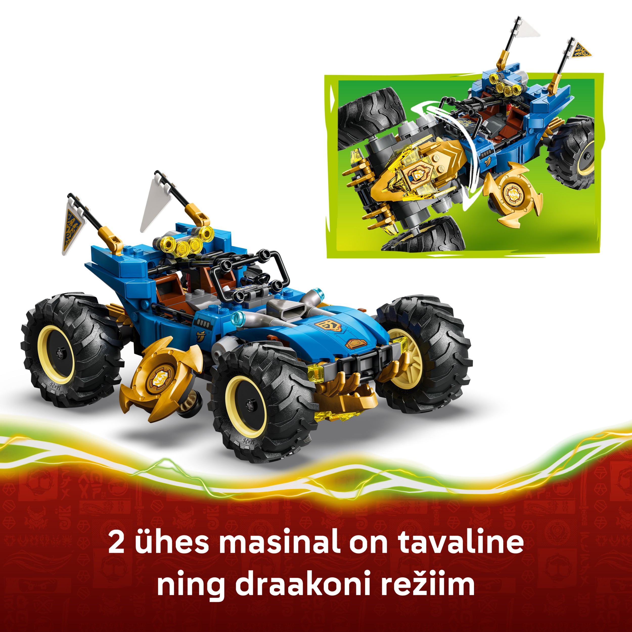 - ROTAĻU SACĪKŠU AUTO BĒRNIEM. Jay pārveidojamais auto (71856) zēniem un meitenēm no 8 gadu vecuma ļauj izspēlēt dinamiskus piedzīvojumus no TV seriāla NINJAGO® Dragons Rising 4. sezonas
