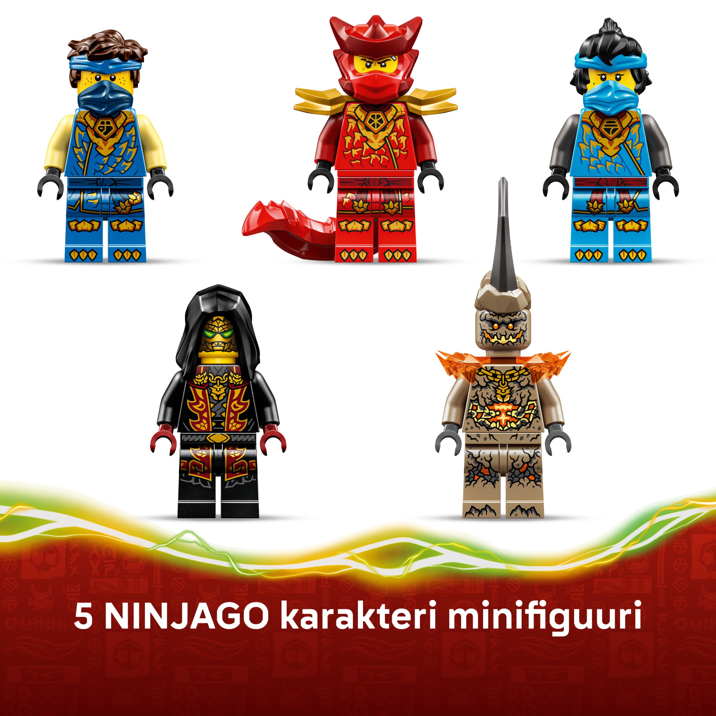 - 5 NINJAGO® MINIFIGŪRAS. Rotaļu nindzju papildina Jay, Nya un pūķa forma Kai, kā arī negantais Zemes briesmonis un Lojālistu līdere, lai bērni varētu izspēlēt cīņas starp labo un ļauno