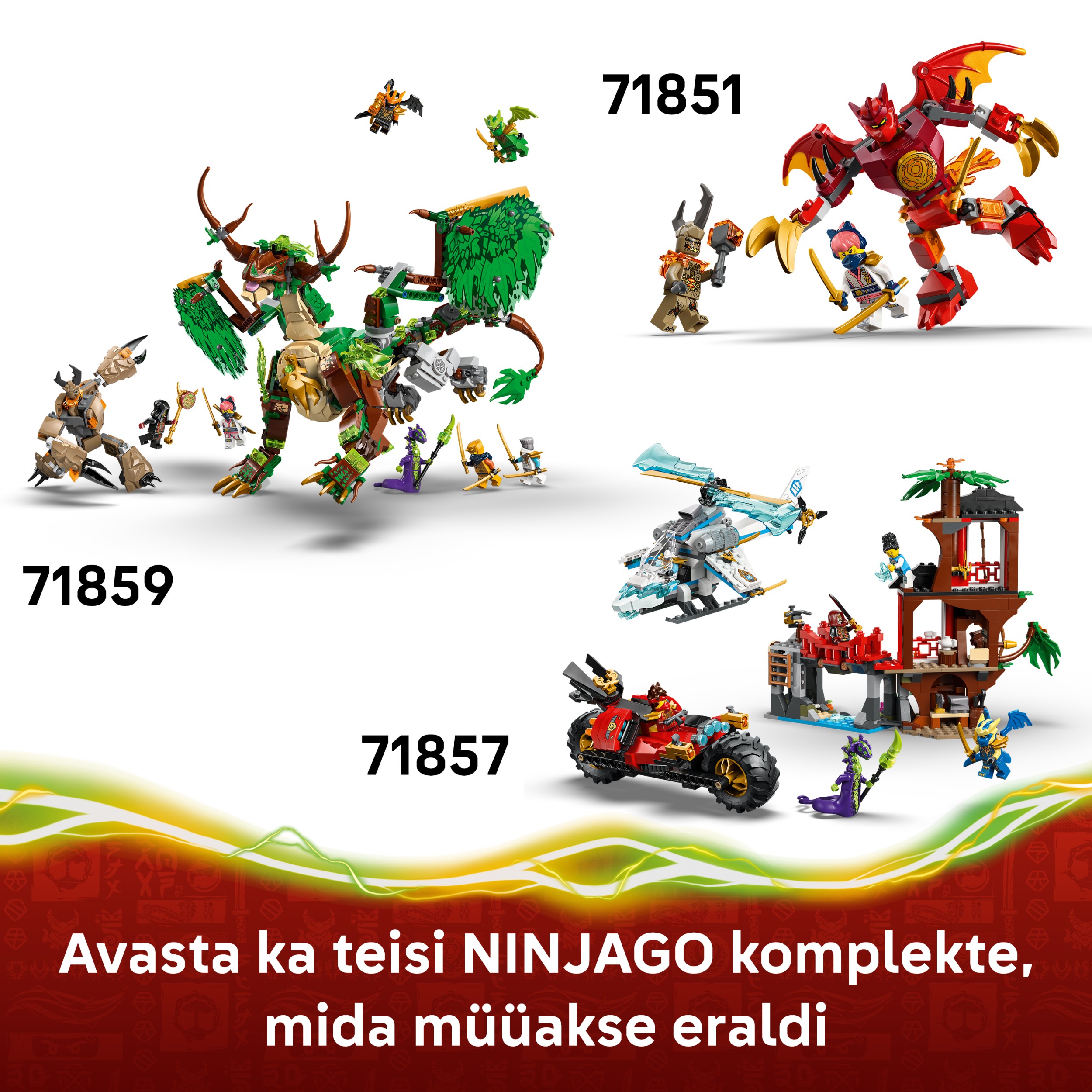 LEGO NINJAGO būvēšanas komplektu un lomu spēļu rotaļlietu klāsts bērniem ietver detalizētus robotus, pūķus un tempļus, ar ko faniem lomās izspēlēt nindzju piedzīvojumus. Bērni katru rotaļu komplektu var būvēt ar pārliecību, izmantojot lietotni LEGO Builder – tajā var tuvināt modeļus un sekot līdzi progresam ar viegli izpildāmām digitālām instrukcijām. Komplektā ir 387 detaļas.
