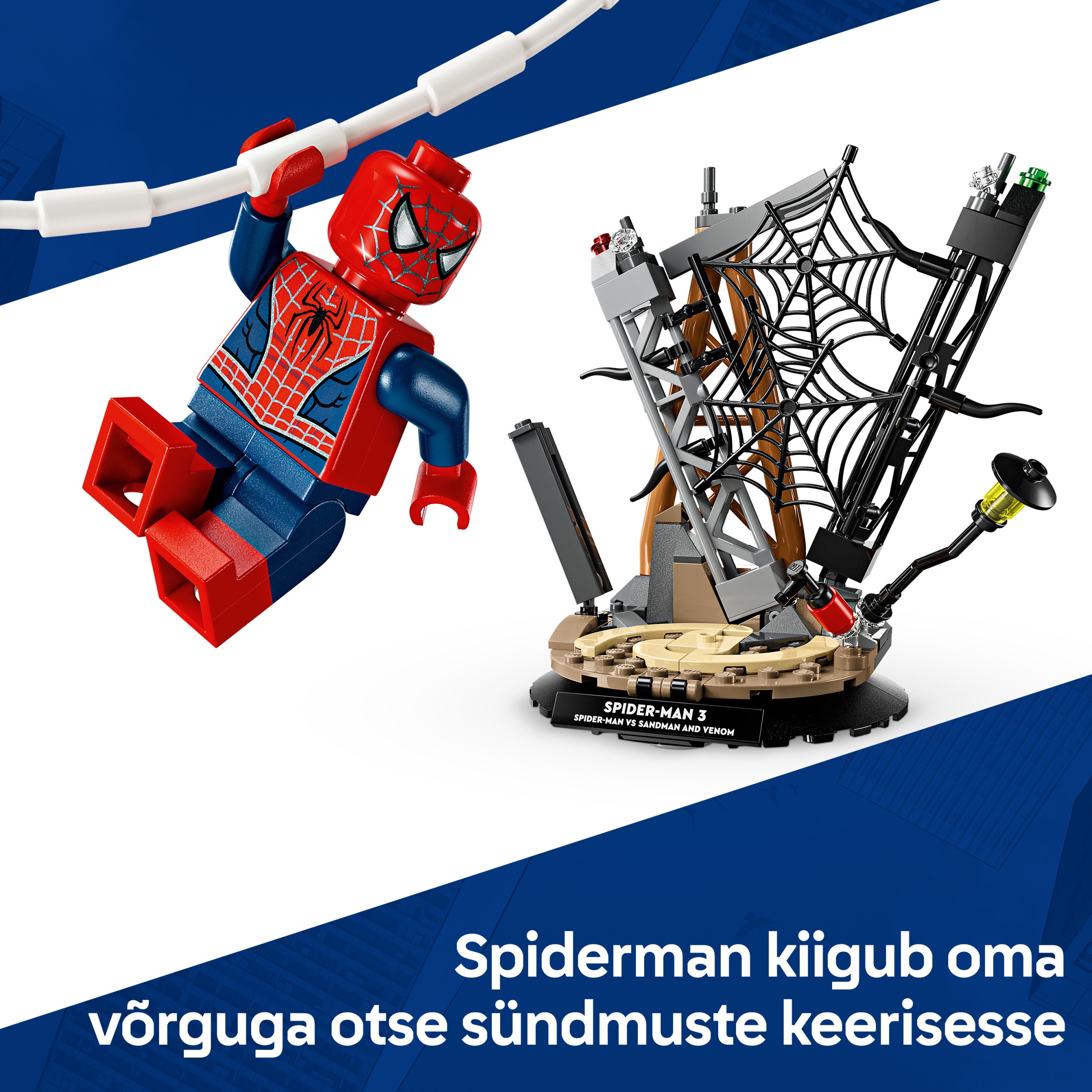 Būvējamajā komplektā ir dažādi tēli no filmas un daudz interaktīvu elementu: Zirnekļcilvēks nolaižas no torņa tīkla virvē; Sandman pieceļas no šķembām ar superizmēra roku; un Venom uzbrūk ar 4 kustīgiem taustekļiem. Bērni var izlikt apskatei LEGO modeli kā telpas dekoru ar izturīgo pamatni un nosaukuma plāksnīti vai noņemt minifigūras, lai radītu paši savus rotaļu stāstus. Šis komplekts ir lieliska dāvana mazajiem supervaroņiem, LEGO būvētājiem un Zirnekļcilvēka piemiņlietu faniem dzimšanas dienā. Turklāt ar lietotni LEGO Builder bērni var būvēt ar pārliecību — tuvināt, grozīt trīs dimensijās un sekot līdzi progresam ar viegli saprotamām digitālām instrukcijām. Būvēšanas komplektā ir 201 detaļa.