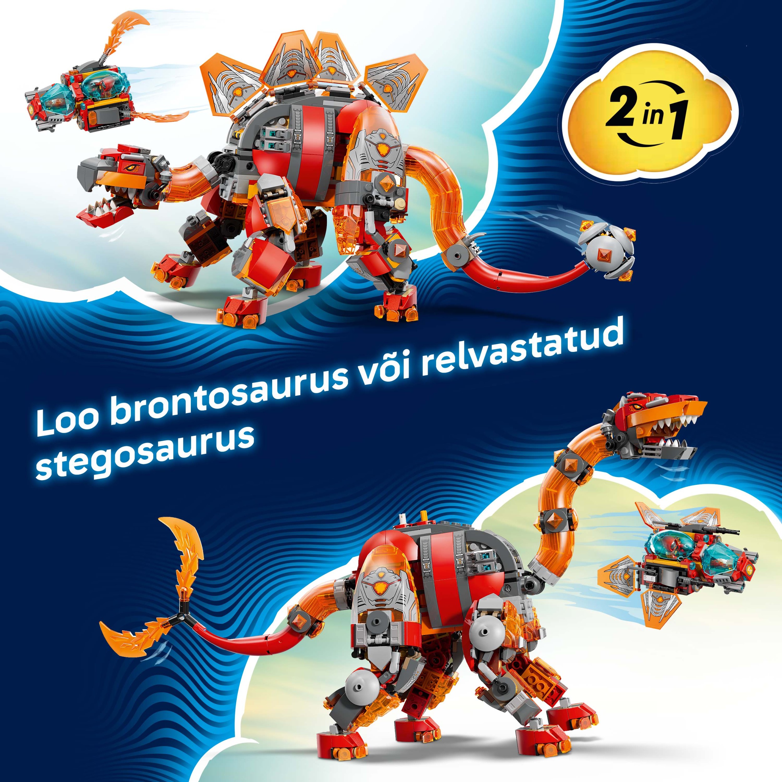 Модель бронтозавра — это огромный динозавр из расплавленного камня с массивным раздвоенным хвостом (готовым смести все на своем пути) и съемным космическим кораблем, а стегозавр — это боевой ящер с усиленной броней, хвостом с пылающей булавой, а космический корабль собирается отдельно. В наборе для сборки динозавра также есть четыре минифигурки, вдохновляющие на творческую игру. Коллекционный аксессуар в виде меча помогает сражаться с тремя пауками, а еще здесь есть алмазное яйцо и живые сокровища оранжевого и синего цветов.