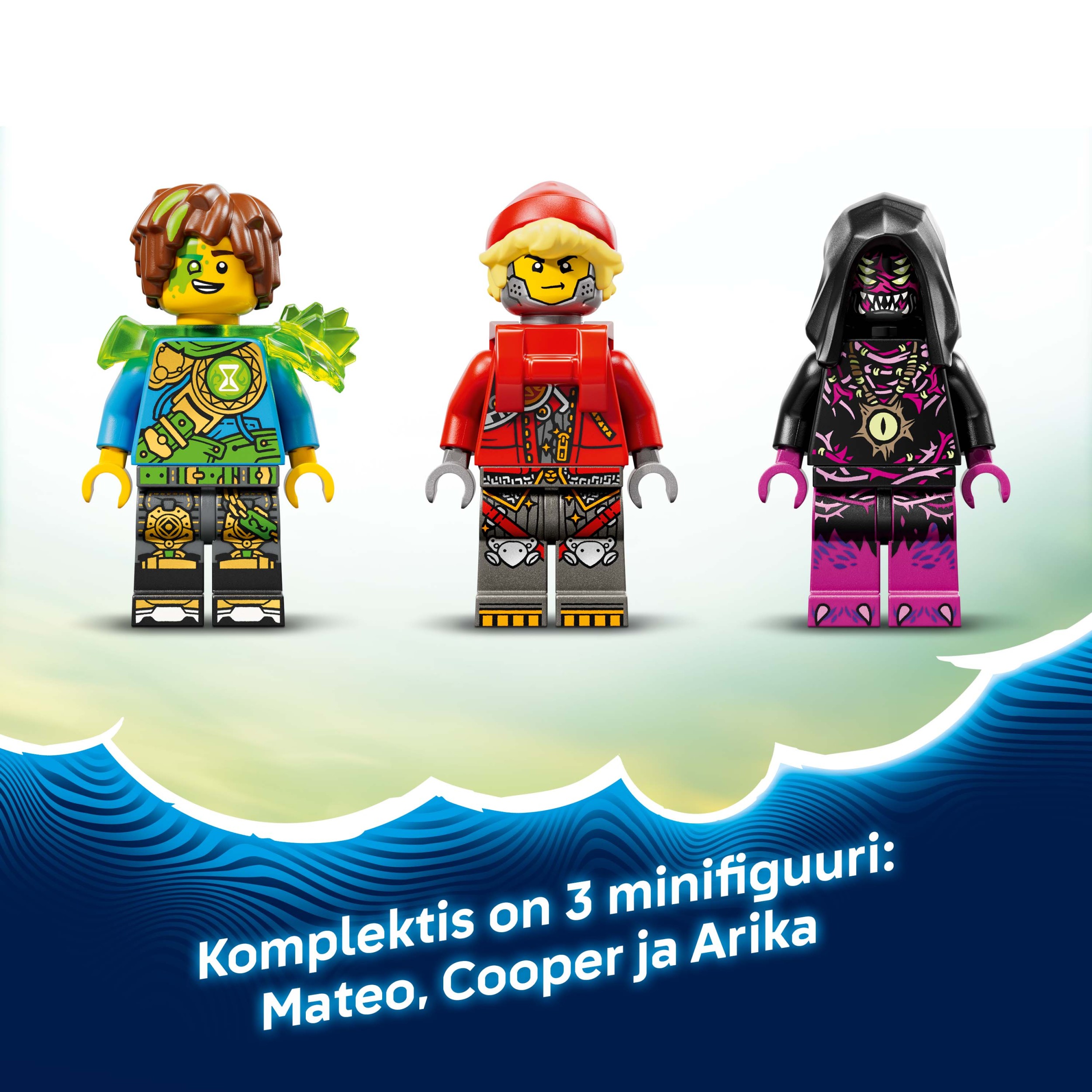 - ТРИ МИНИФИГУРКИ LEGO® DREAMZZ™ — в наборе есть минифигурки Матео, Купера и Арики, чтобы оживить игру, а также фигурка Зи–Блоба и коллекционная фигурка оранжевого живого сокровища.