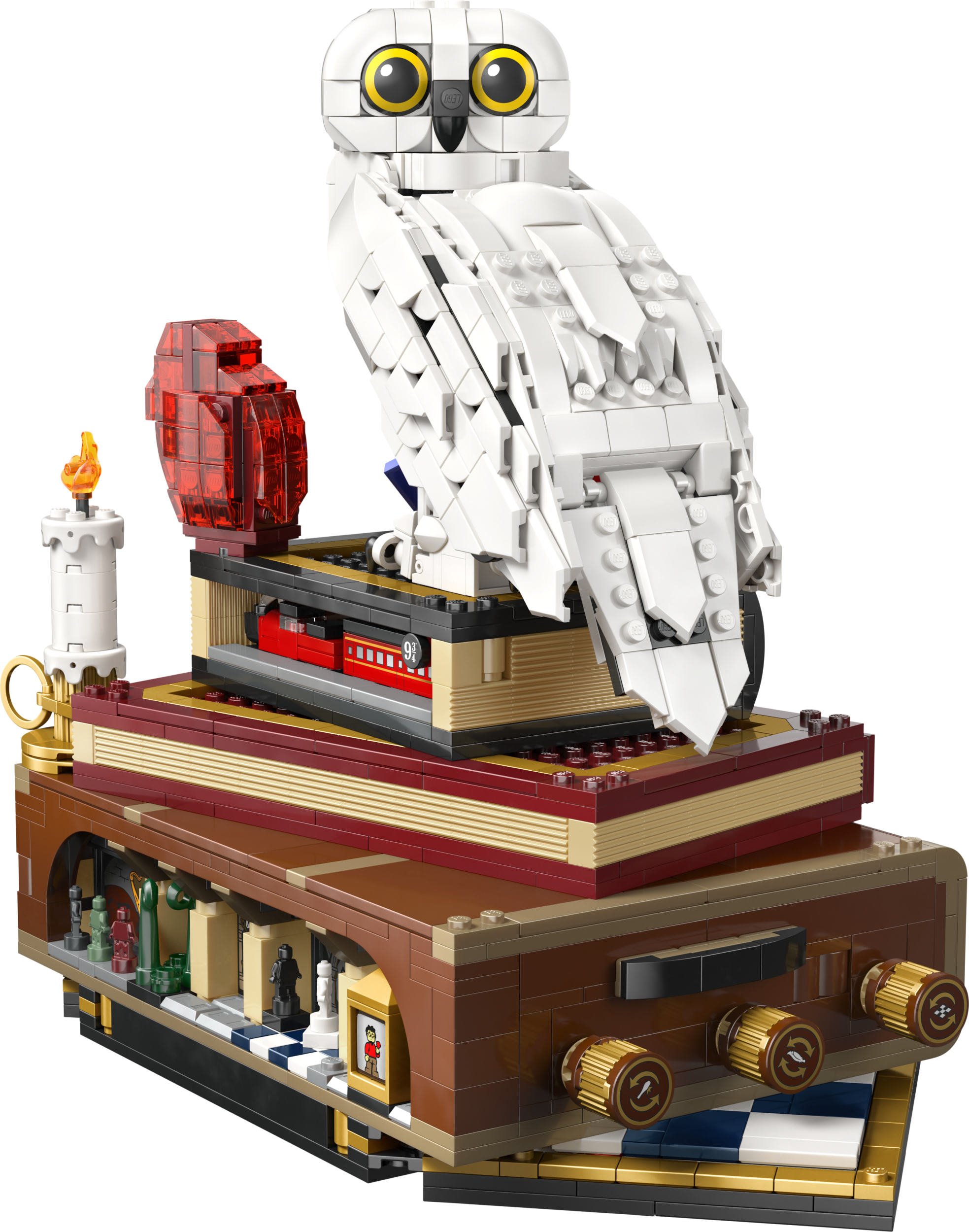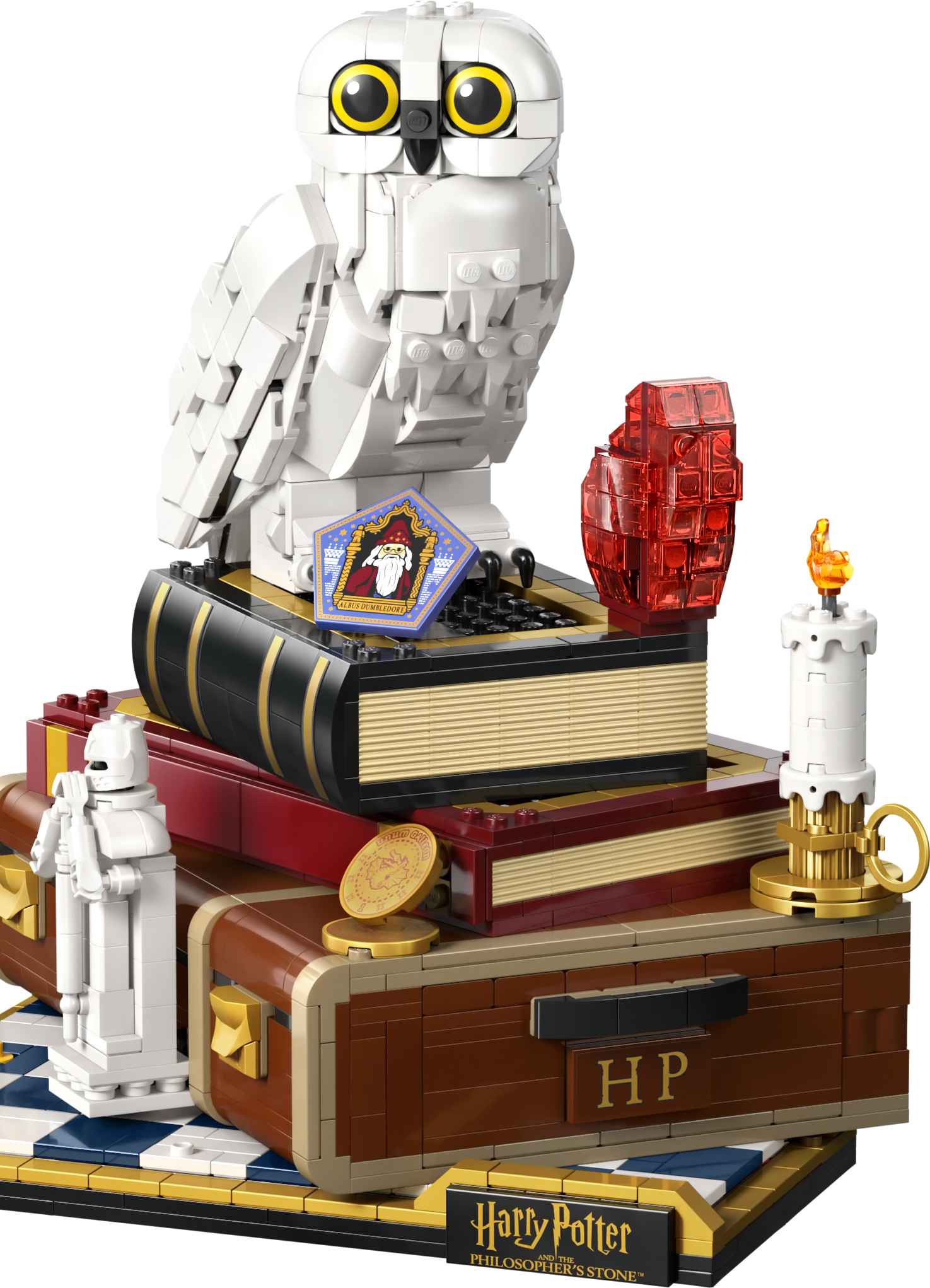 Собери первую фигурку LEGO полярной совы Букли со сложенными крыльями и выставьте ее рядом с философским камнем на чемодане Гарри Поттера. Добавьте 3 минифигурки LEGO Harry Potter — Гарри Поттера, Гермиону Грейнджер и Рона Уизли — и такие предметы, как карточка из шоколадной лягушки и доска для волшебных шахмат.